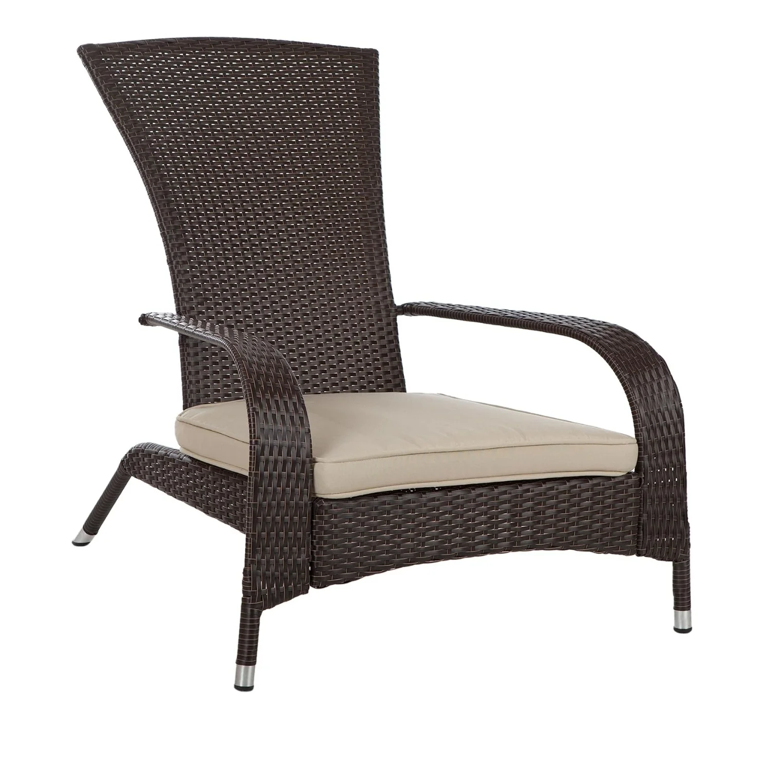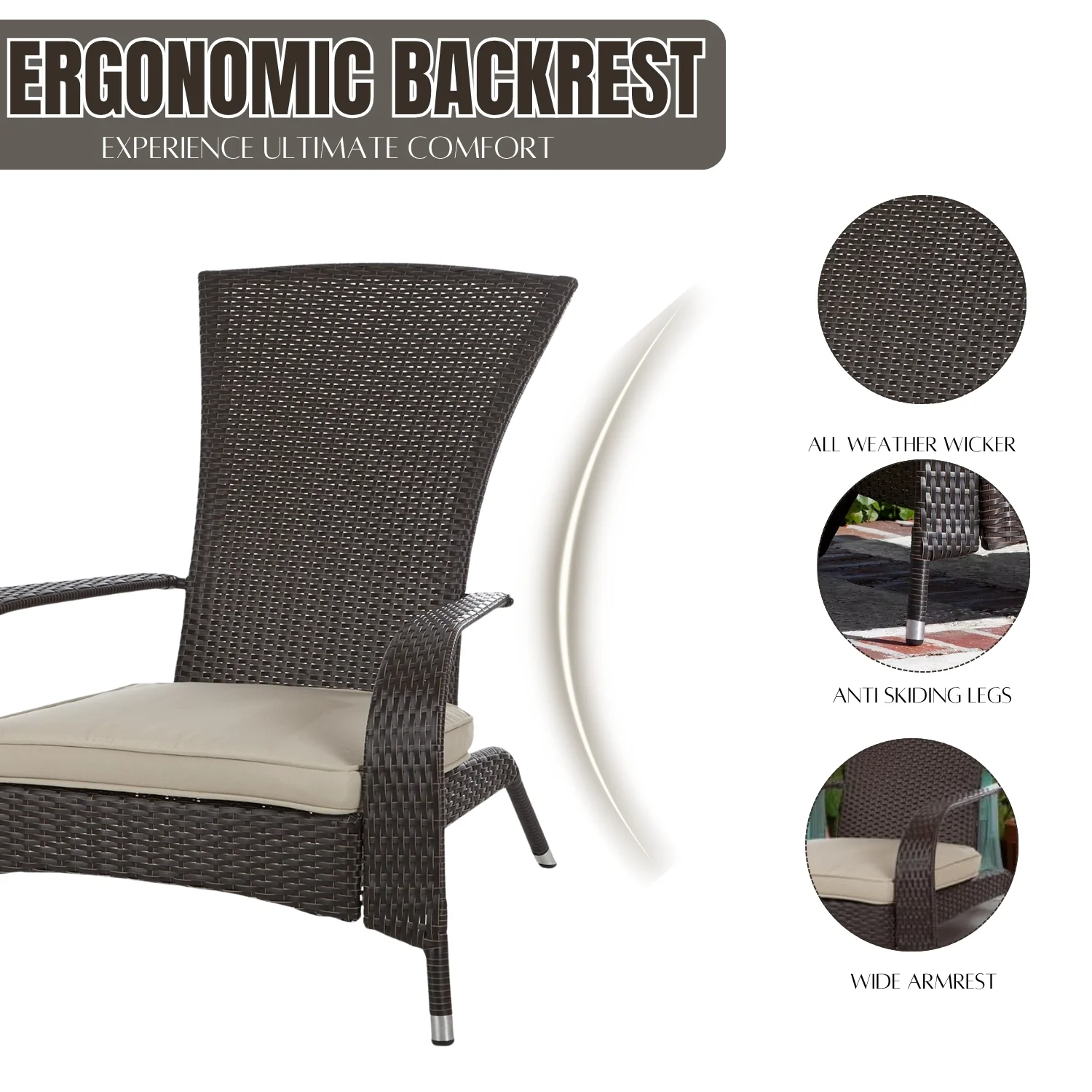 Transform any space—be it your cozy balcony, sunny garden, or breezy poolside into a retreat of comfort and relaxation with our Patio Wicker Adirondack Style Armchair. Thoughtfully crafted to blend timeless design with modern durability, this chair redefines outdoor lounging. Inspired by the classic Adirondack silhouette, it features wide armrests, a gently sloped seat, and a high back for full-body support and unmatched comfort. Handwoven with all-weather brown wicker, the frame resists fading, moisture, and cracking, making it ideal for year-round use whether under the sun or in covered indoor spaces. The sturdy yet lightweight design allows you to move it effortlessly from deck to den. Sink into the generously cushioned seat, wrapped in cream-colored, water resistant fabric that’s not only soft to the touch but also easy to clean and maintain. Whether you’re enjoying your morning coffee, reading a book on the porch, or entertaining friends in the backyard, this chair elevates your lounging experience.