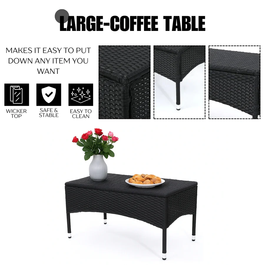 • Comfortable Cushions & Wicker-Top Table : Includes plush seat cushions with removable, washable covers for easy care. The sturdy coffee table features a wicker top – perfect for snacks, drinks, or décor.