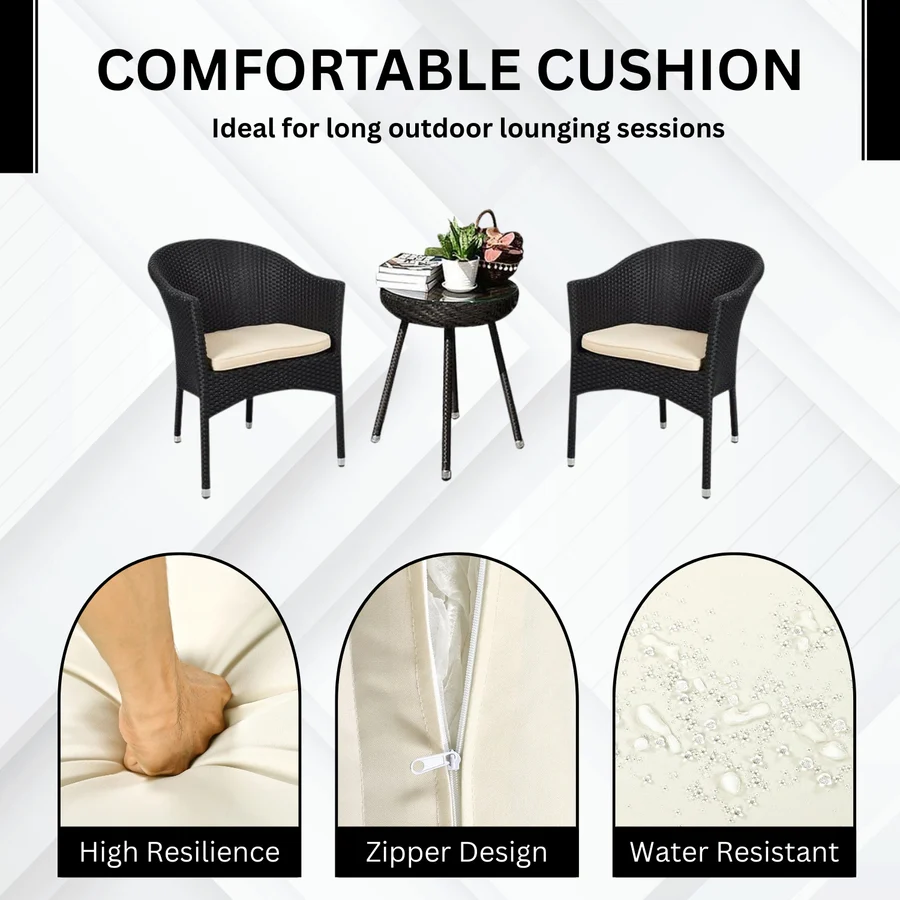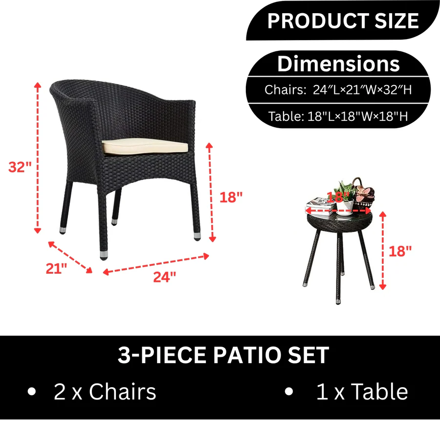Transform your outdoor space into a cozy retreat with this stylish and practical 3-piece Rattan Wicker Patio Set, designed to bring both comfort and charm to your front porch, balcony, garden, or backyard. Crafted with a modern eye and a nod to timeless elegance, this set includes two ergonomic armchairs and a compact wicker-top coffee table, offering the perfect spot to enjoy your morning coffee, unwind after a long day, or entertain guests in style. Built with a durable powder-coated metal frame and wrapped in handwoven all-weather HDPE rattan, the chairs are lightweight yet strong enough to withstand daily use in any season. The black wicker finish adds a natural, earthy touch, while the cream cushions provide soft, breathable comfort.
