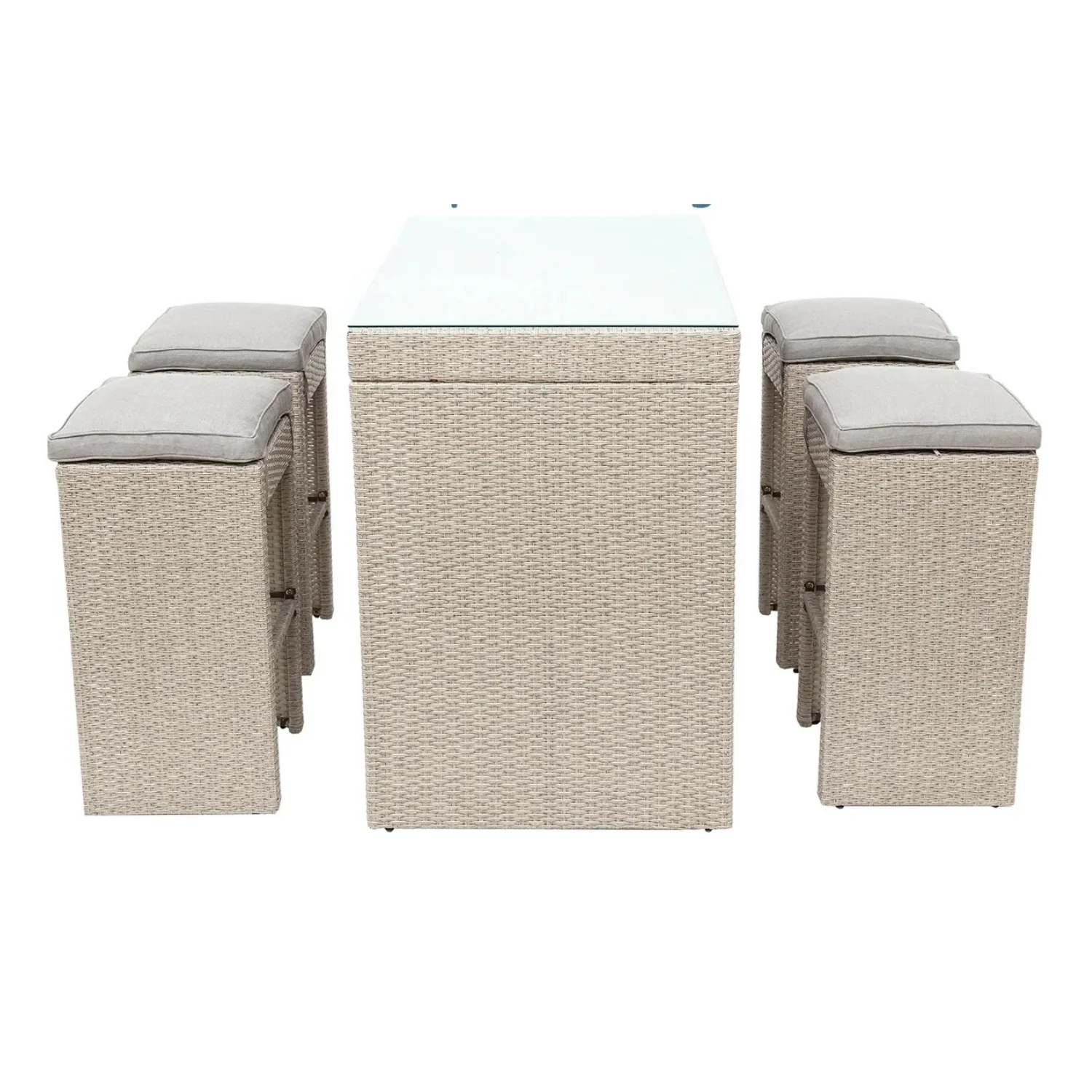 Upgrade your outdoor gatherings with this stylish 4-seater wicker bar set featuring a high-top table and cushioned stools. Crafted from premium all-weather HDPE rattan, this bar set is built to withstand sun, rain, and daily use without fading or cracking. The sturdy powder-coated iron frame provides long-lasting durability and stability, making it perfect for your patio, garden, balcony, or poolside lounge. The high-top bar table features a sleek, scratch-resistant glass surface—ideal for drinks, snacks, and decorative displays. Six ergonomically designed stools include thick, water-resistant cushions with removable washable covers for added comfort and easy care