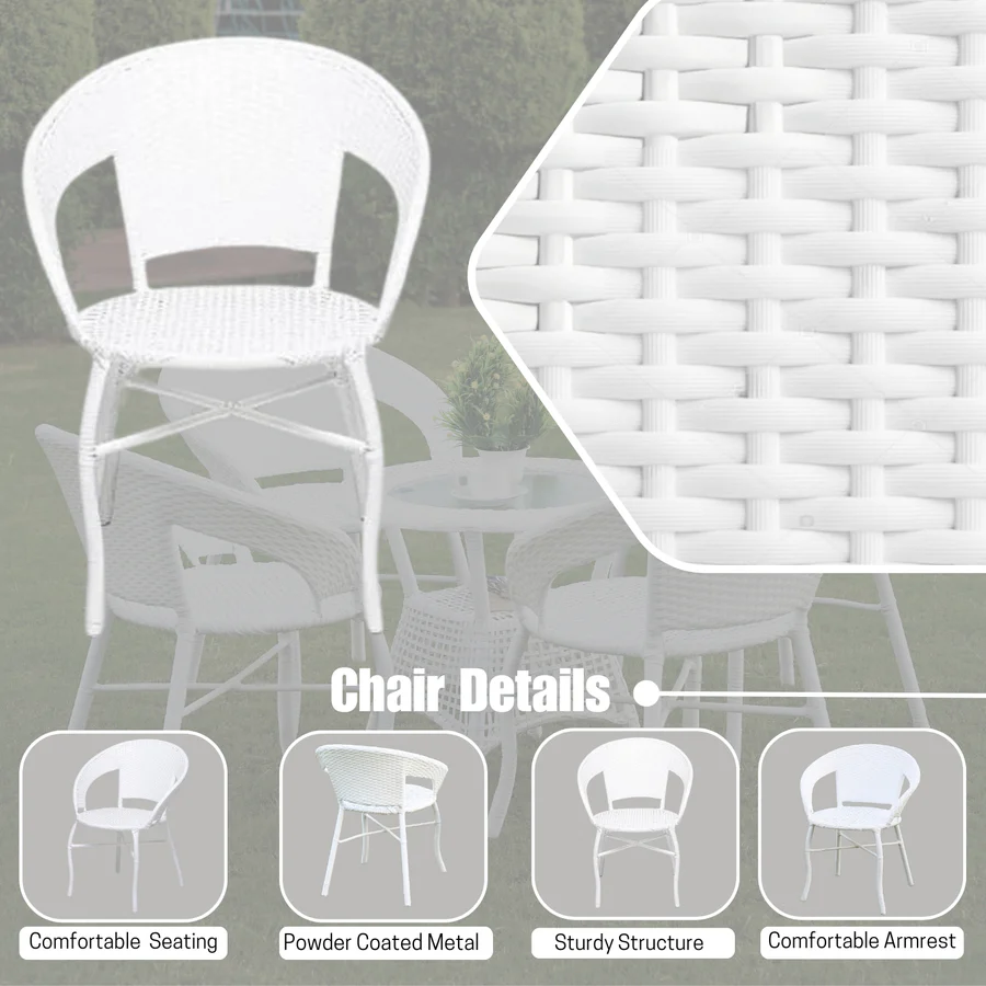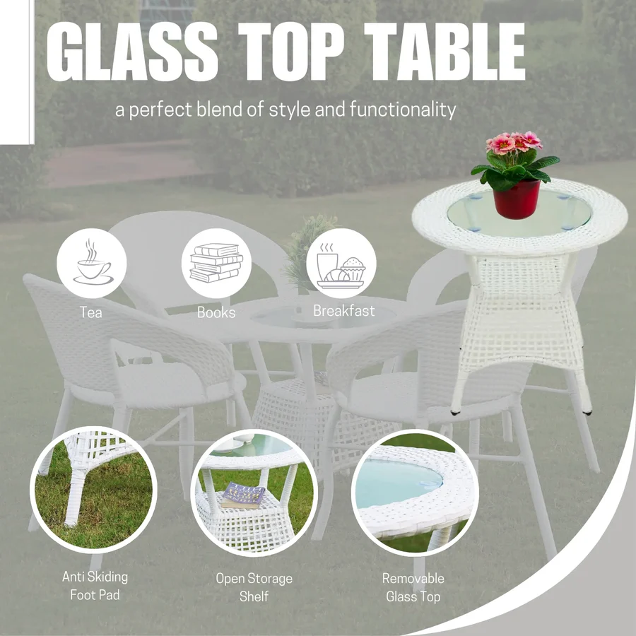 Elevate your garden, balcony, porch, or poolside with this 5-Piece Outdoor Rattan Wicker Patio Bistro Set a perfect blend of timeless style and lasting performance. Designed with an eye for detail and built for year-round use, this elegant set includes four cozy chairs, and a sleek glass top table. The white all-weather wicker weaves a natural charm that complements any outdoor décor, while the sturdy powder-coated frame ensures stability, rust resistance, and long-lasting durability.