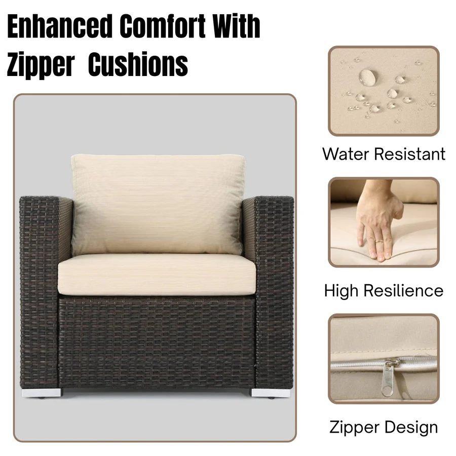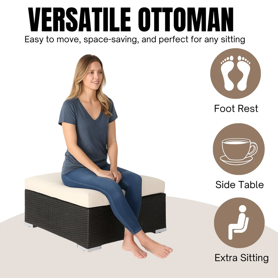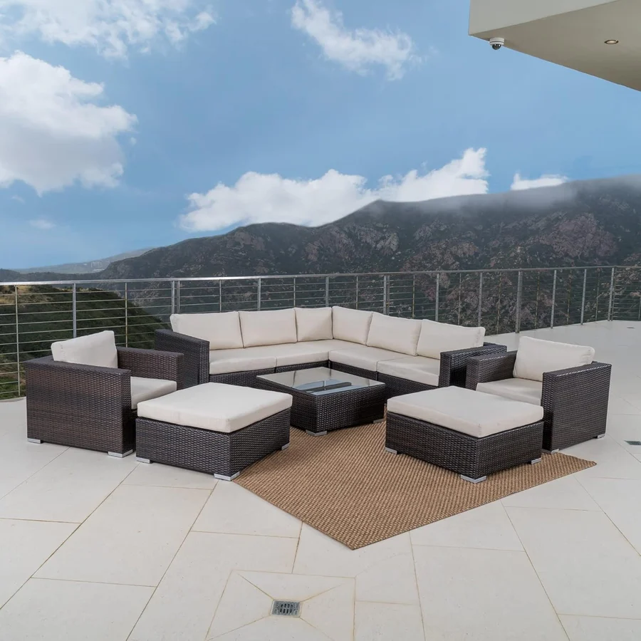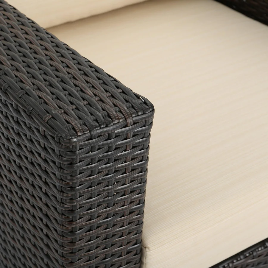 Elevate your outdoor living experience with this beautifully crafted Manual Weaving Wicker Sectional Sofa Set, designed to blend comfort, durability, and timeless style. Whether it’s your porch, lawn, garden, or backyard, this premium HDPE rattan furniture set adds a luxurious yet practical touch to your outdoor setting. Handwoven using high-quality, weather-resistant HDPE wicker, the set ensures long-lasting durability through all seasons. The powder-coated metal frame provides a strong foundation that resists rust and corrosion, making it ideal for extended outdoor use. Designed with user comfort in mind, this set includes thick, soft cream-colored cushions with washable covers, ensuring a plush seating experience that’s easy to maintain. The modular design allows you to arrange the pieces to best suit your space and style, offering maximum flexibility for gatherings, lounging, or quiet evening relaxation.