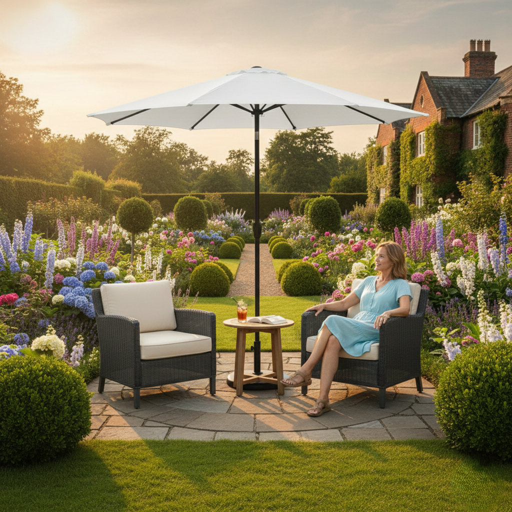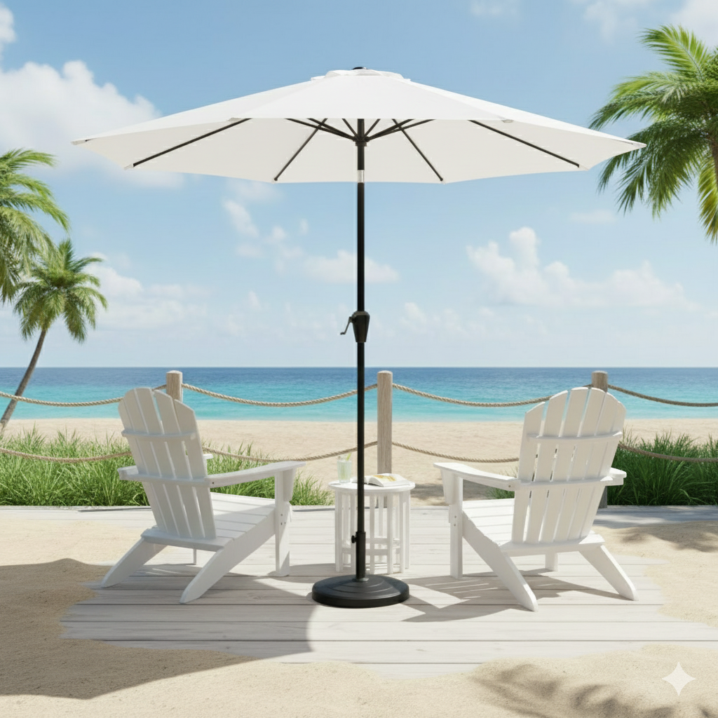 Patio Umbrellas elegantly extend their MS Powder Coated ribs, creating a spacious 9-foot circle of shade ideal for patios and terraces. This umbrella also features a sleek iron pole that fits into a circular polyethylene stand. These umbrellas boast classic silhouettes that not only enhance aesthetics but also offer practical features such as easy crank lifting and a convenient push-button tilt mechanism, ensuring protection from both the sun’s rays and pesky neighbors. Crafted from durable Polyester fabric, they effectively block sunlight while retaining their vibrant color, High durable resin housing and hub, maintaining style and functionality for countless sunny afternoons.
