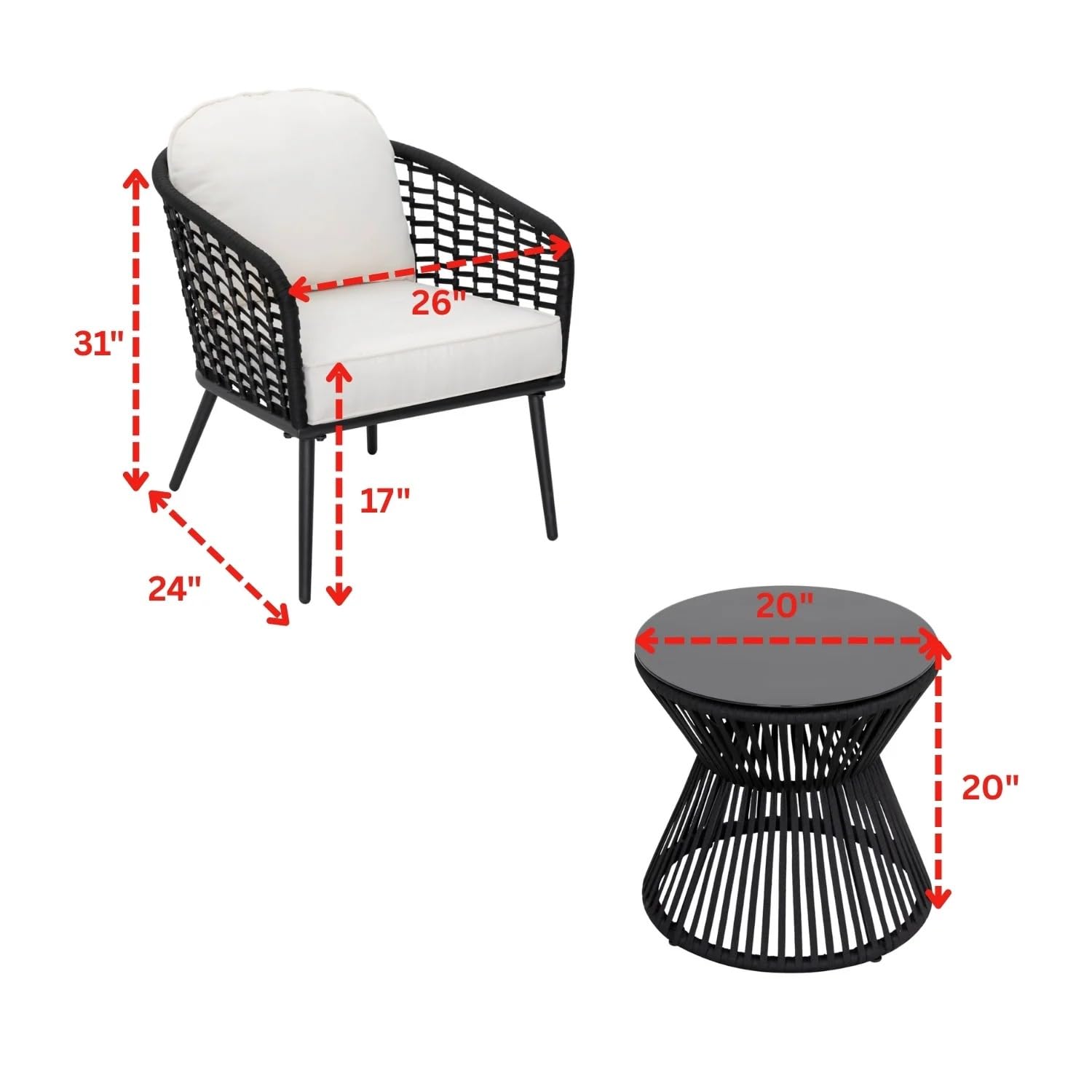 This patio bistro set features a sturdy powder-coated iron frame wrapped with hand-woven rope, offering both durability and modern style. Each chair is professionally pressure tested and can support up to 125 kg, ensuring reliable strength and long-lasting performance.