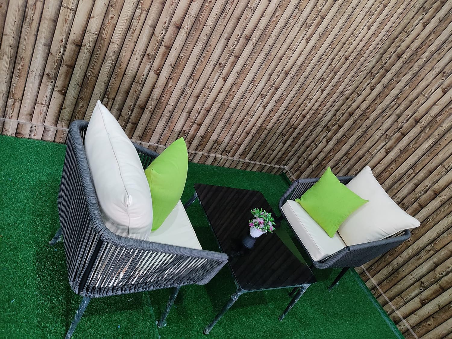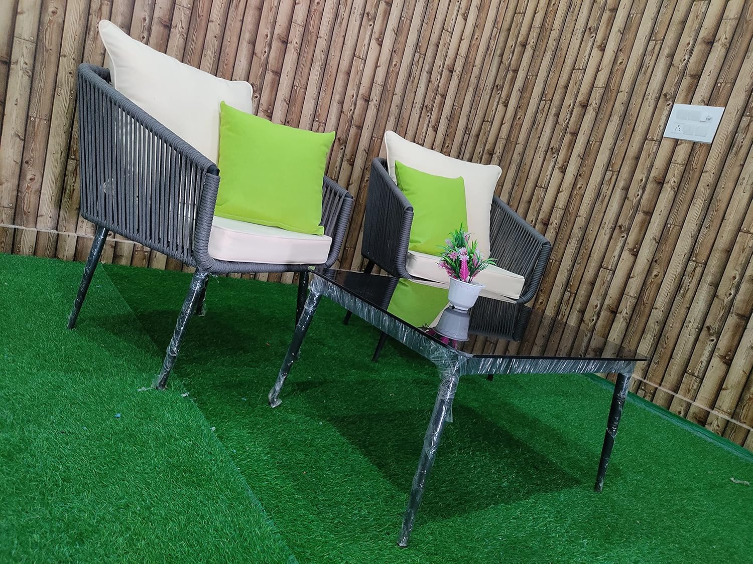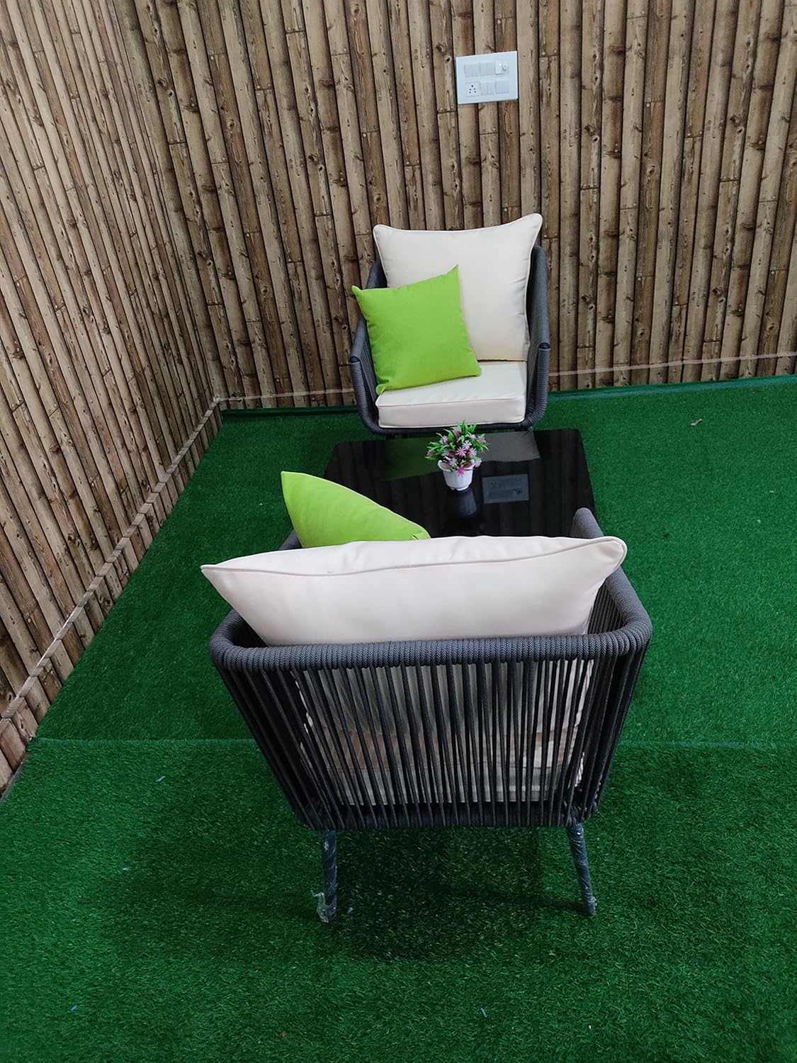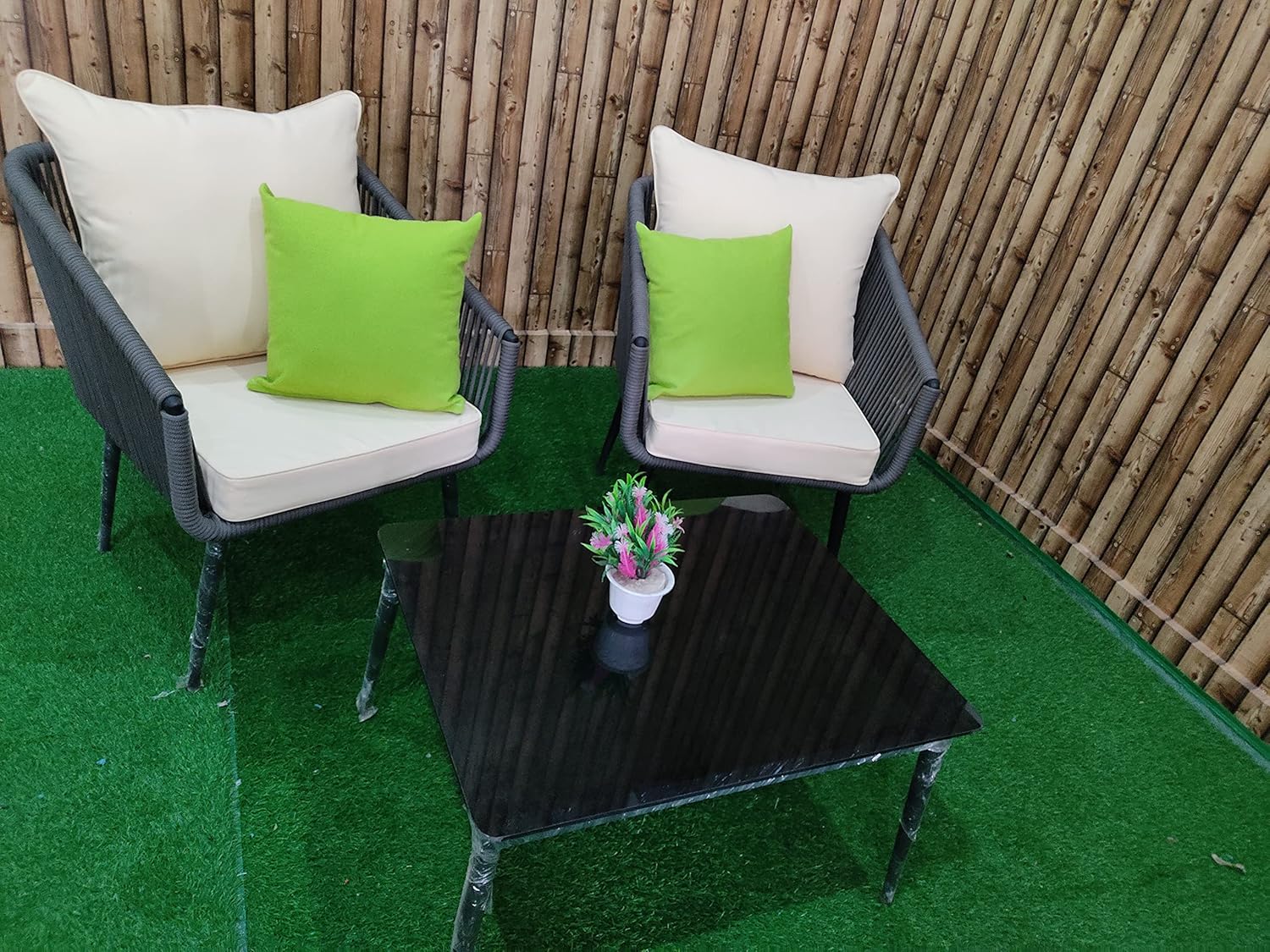 Includes two comfortable single chairs and a tempered glass-top table, perfect for creating a cozy seating area in your patio, balcony, garden, courtyard, backyard, porch, or poolside.
