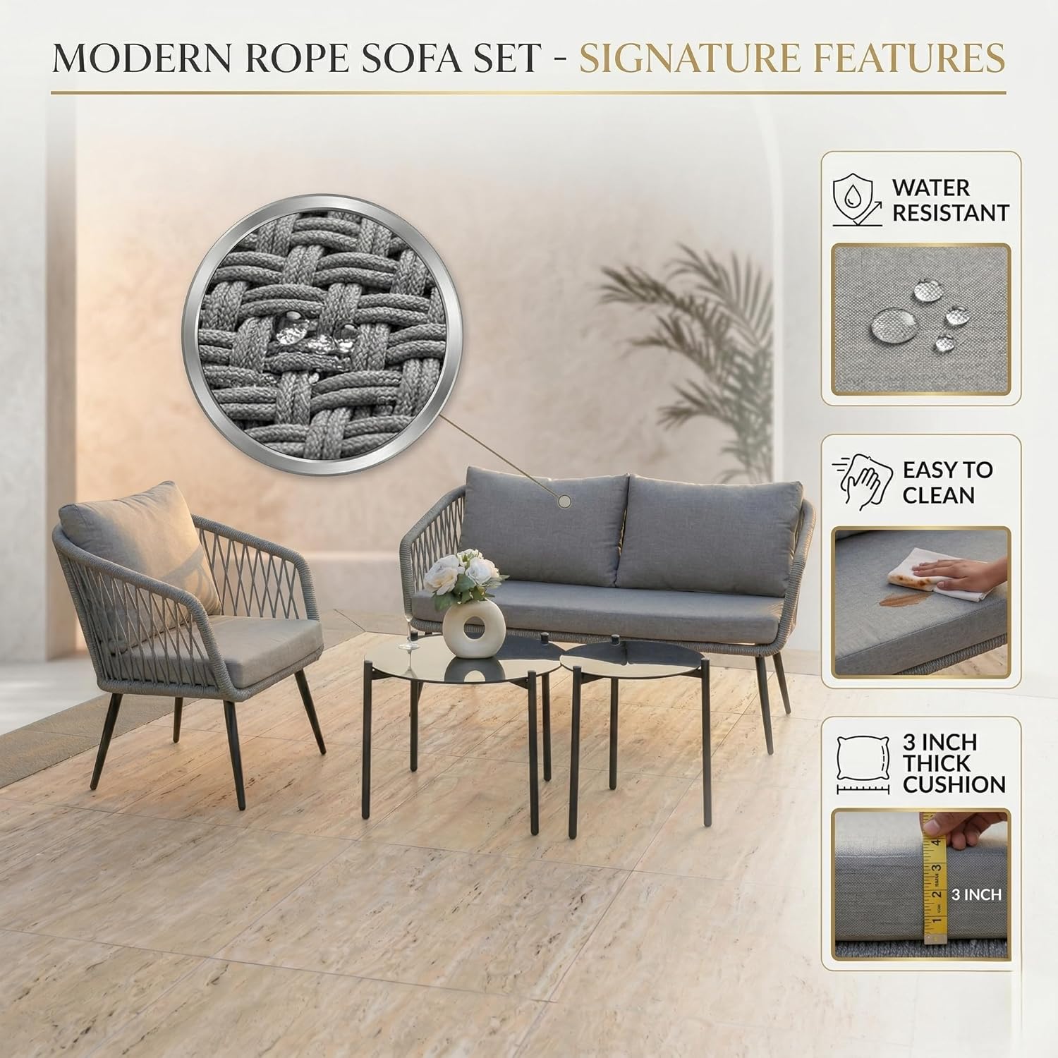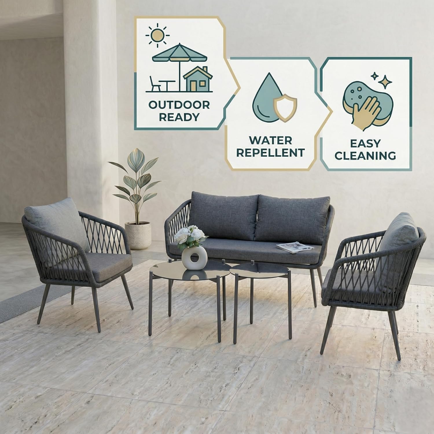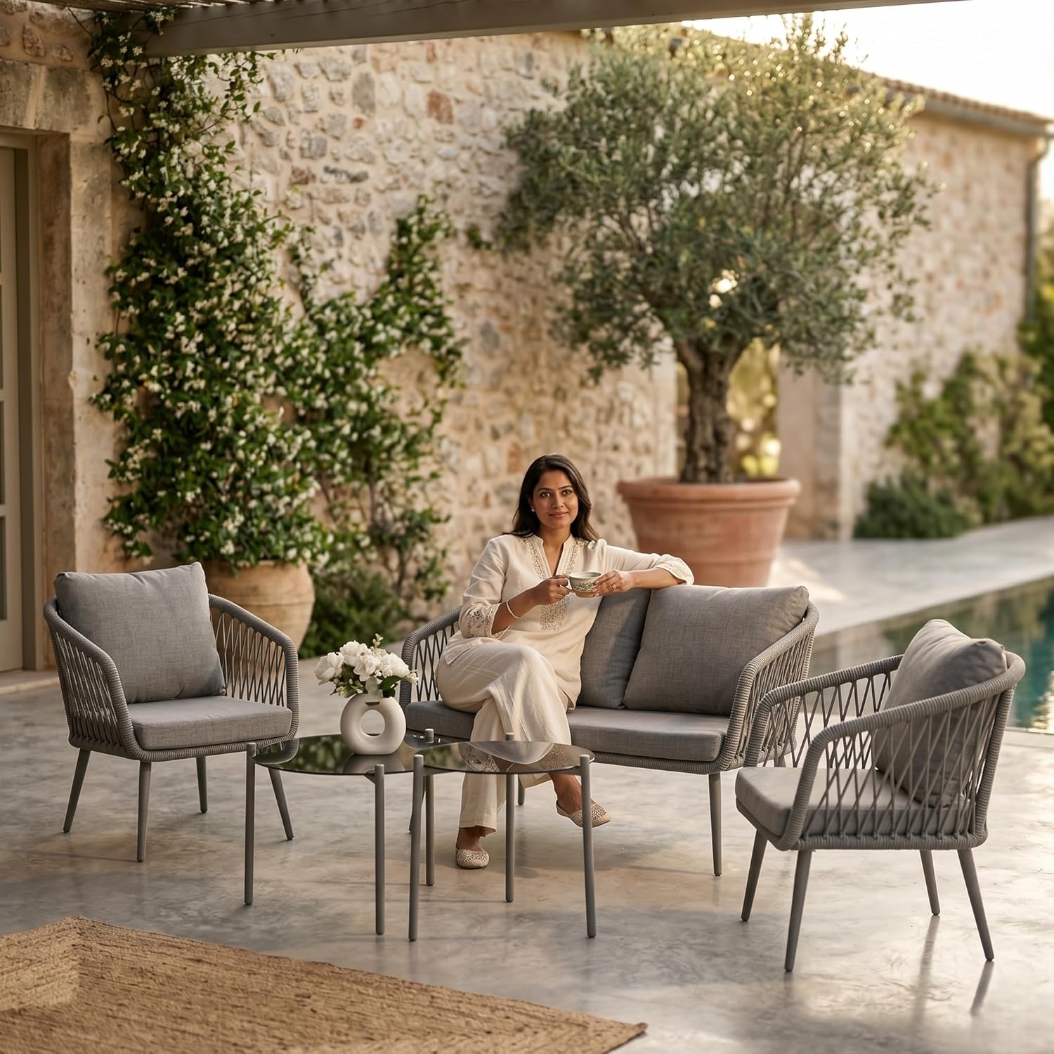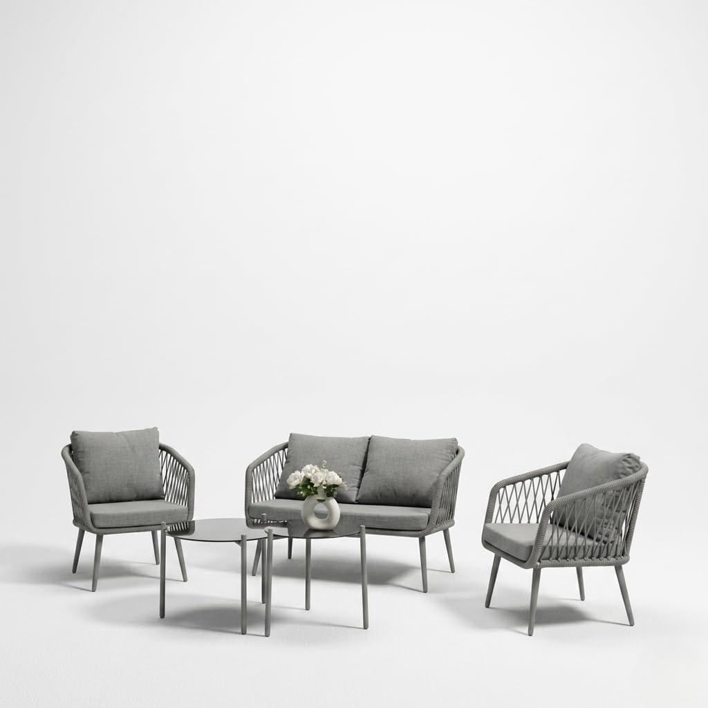 Transform your outdoor space with this modern 4-seater outdoor rope sofa set, designed to deliver the perfect combination of style, durability, and comfort. Ideal for patio, garden, balcony, terrace, lawn, backyard, and poolside seating, this premium outdoor furniture set enhances any space with its sleek and contemporary design. Engineered with a heavy-duty powder-coated metal frame, this outdoor sofa set offers superior strength, stability, and rust resistance, making it perfect for long-term use in all weather conditions. The robust yet lightweight structure allows for easy movement and flexible arrangement, giving you complete control over your outdoor setup. The seating is crafted with high-quality, UV-resistant rope weaving, ensuring excellent breathability, flexibility, and ergonomic support. This all-weather rope design resists fading, moisture, and wear, making it ideal for everyday outdoor use while maintaining its modern aesthetic appeal. Enjoy enhanced relaxation with thick, plush water-repellent cushions that provide exceptional comfort and support. Designed for all-weather performance, these cushions are easy to clean, quick-drying, and durable, making them perfect for daily lounging or entertaining guests. The elegant beige and cream color combination adds a refined and calming touch to your outdoor décor. The set also includes a stylish glass-top center table, offering a smooth, sturdy surface for serving drinks, snacks, or displaying décor. Its modern design and easy maintenance make it a practical and attractive addition to your outdoor furniture setup. Perfectly suited for both compact and spacious areas, this 4-seater outdoor conversation set includes a double seater sofa, two single chairs, and a center table. Whether you’re hosting gatherings, enjoying family time, or relaxing outdoors, this versatile set adapts effortlessly to your lifestyle. Upgrade your outdoor living experience with this durable, weather-resistant, and stylish outdoor furniture set, designed for comfort, functionality, and long-lasting performance.