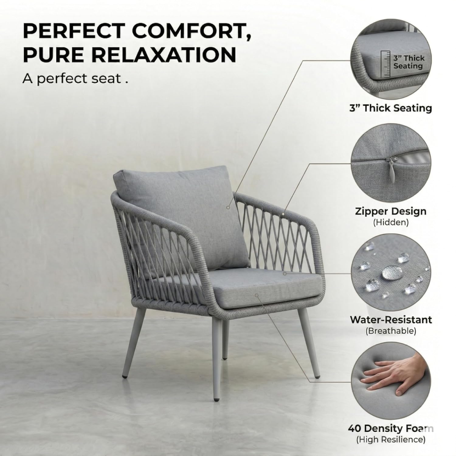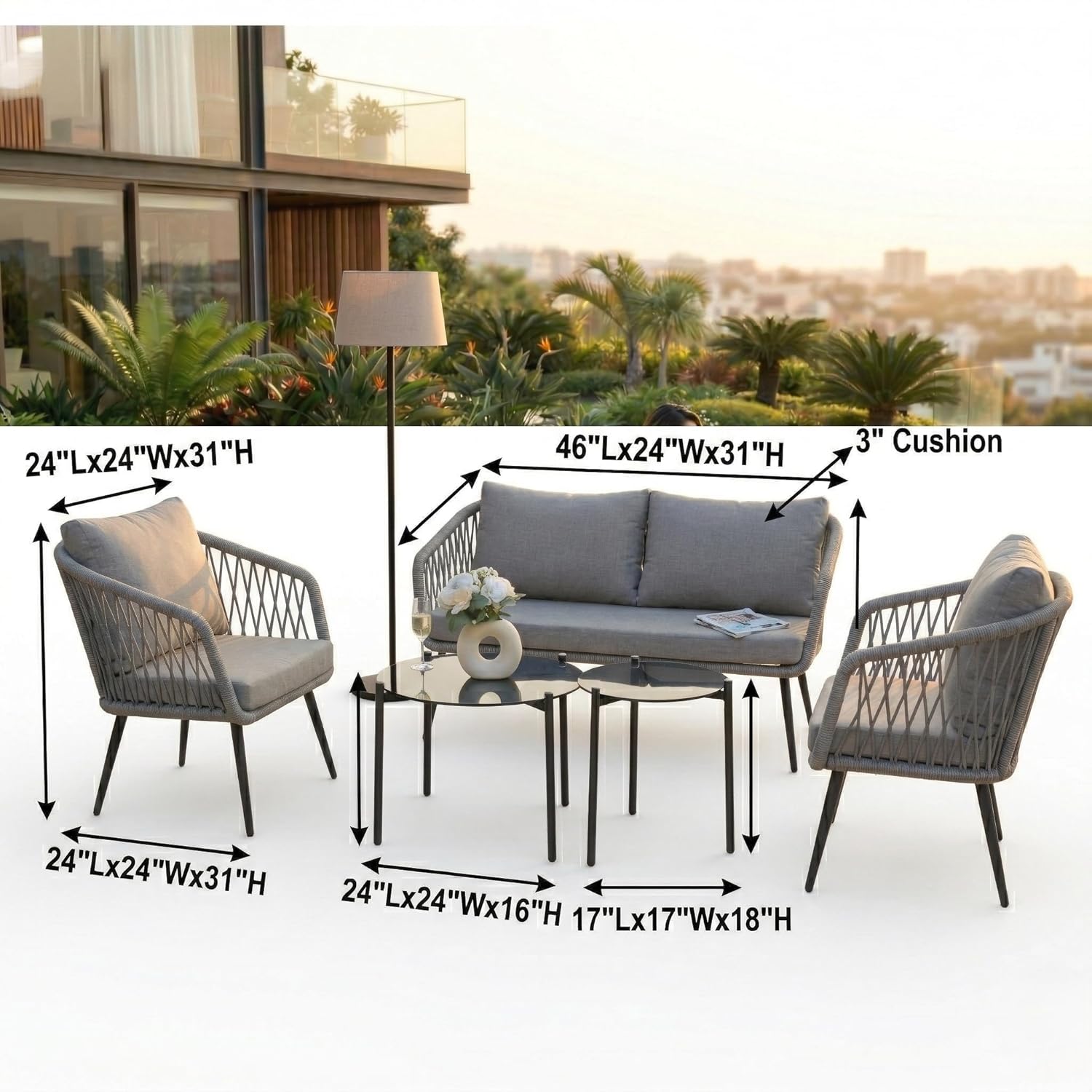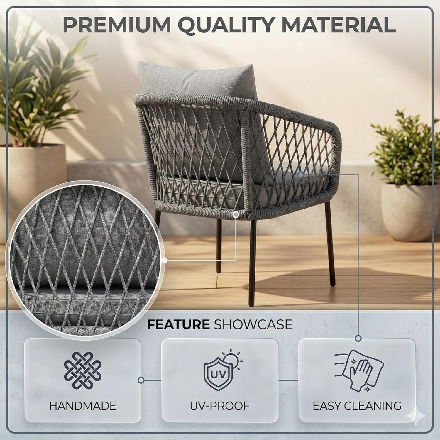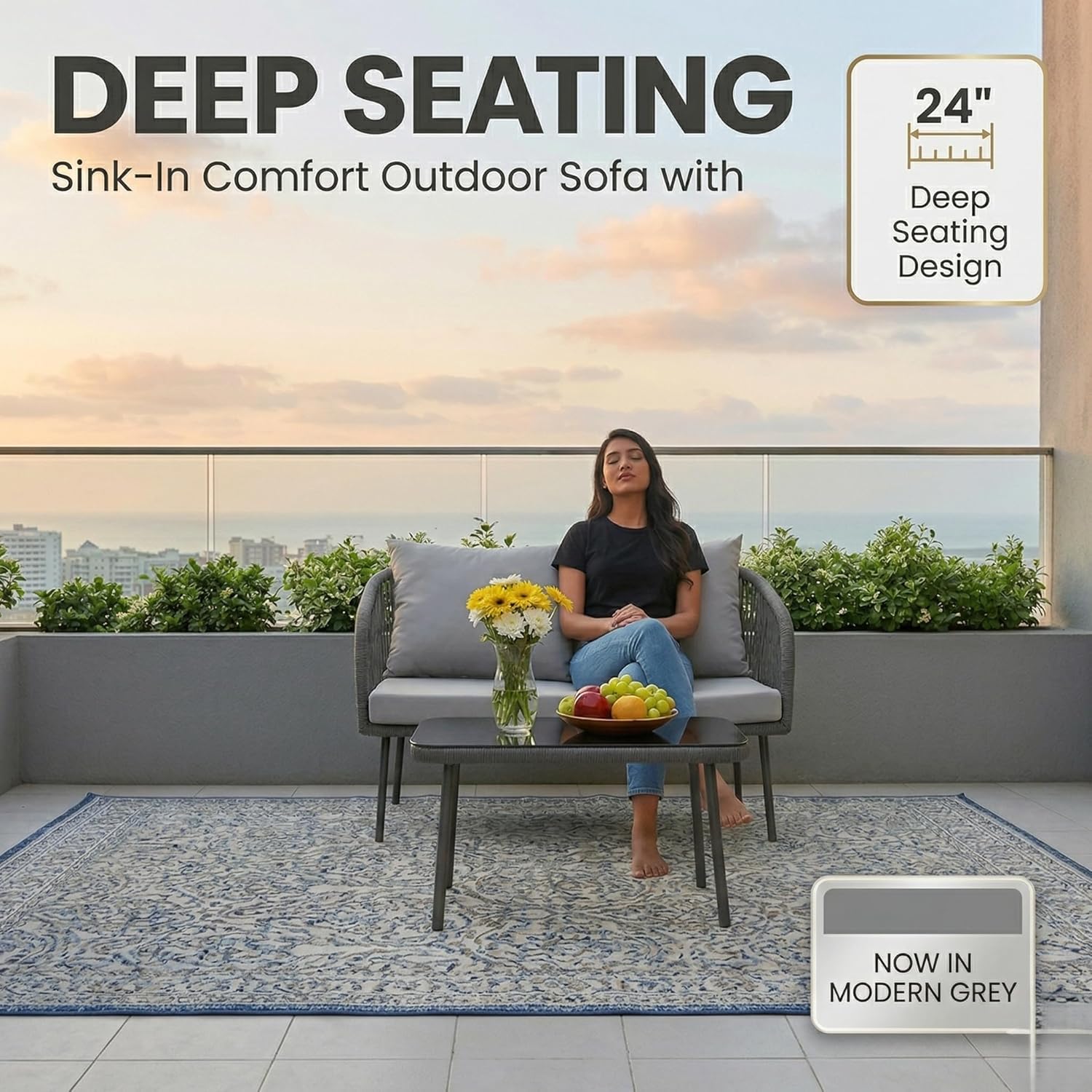 Transform your outdoor space with this modern 4-seater outdoor rope sofa set, designed to deliver the perfect combination of style, durability, and comfort. Ideal for patio, garden, balcony, terrace, lawn, backyard, and poolside seating, this premium outdoor furniture set enhances any space with its sleek and contemporary design. Engineered with a heavy-duty powder-coated metal frame, this outdoor sofa set offers superior strength, stability, and rust resistance, making it perfect for long-term use in all weather conditions. The robust yet lightweight structure allows for easy movement and flexible arrangement, giving you complete control over your outdoor setup. The seating is crafted with high-quality, UV-resistant rope weaving, ensuring excellent breathability, flexibility, and ergonomic support. This all-weather rope design resists fading, moisture, and wear, making it ideal for everyday outdoor use while maintaining its modern aesthetic appeal. Enjoy enhanced relaxation with thick, plush water-repellent cushions that provide exceptional comfort and support. Designed for all-weather performance, these cushions are easy to clean, quick-drying, and durable, making them perfect for daily lounging or entertaining guests. The elegant beige and cream color combination adds a refined and calming touch to your outdoor décor. The set also includes a stylish glass-top center table, offering a smooth, sturdy surface for serving drinks, snacks, or displaying décor. Its modern design and easy maintenance make it a practical and attractive addition to your outdoor furniture setup. Perfectly suited for both compact and spacious areas, this 4-seater outdoor conversation set includes a double seater sofa, two single chairs, and a center table. Whether you’re hosting gatherings, enjoying family time, or relaxing outdoors, this versatile set adapts effortlessly to your lifestyle. Upgrade your outdoor living experience with this durable, weather-resistant, and stylish outdoor furniture set, designed for comfort, functionality, and long-lasting performance.