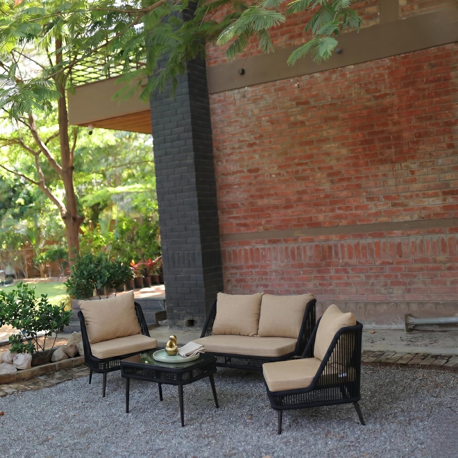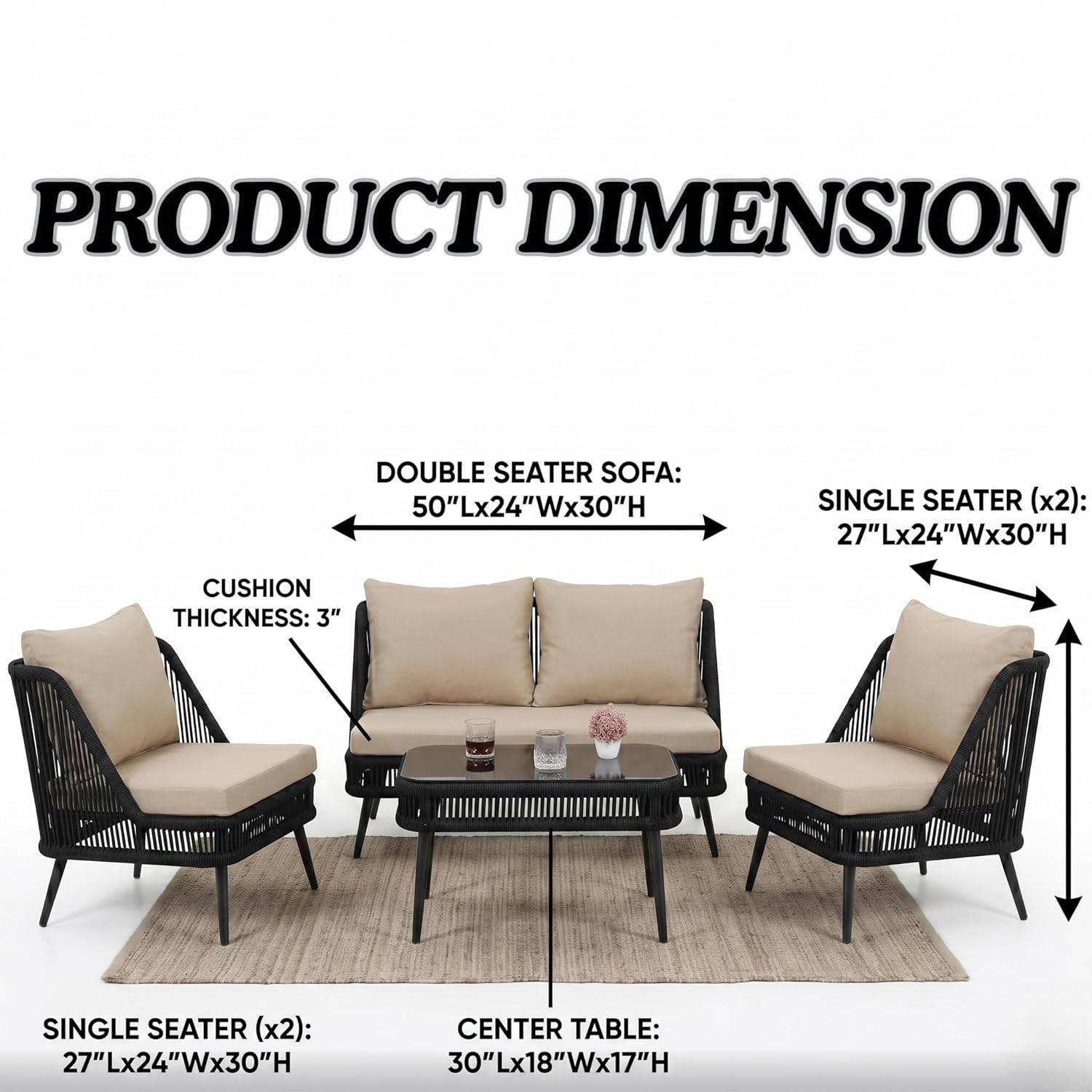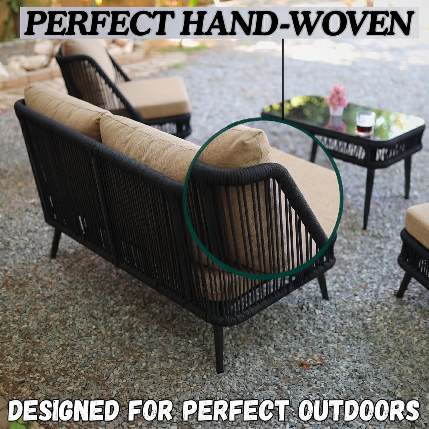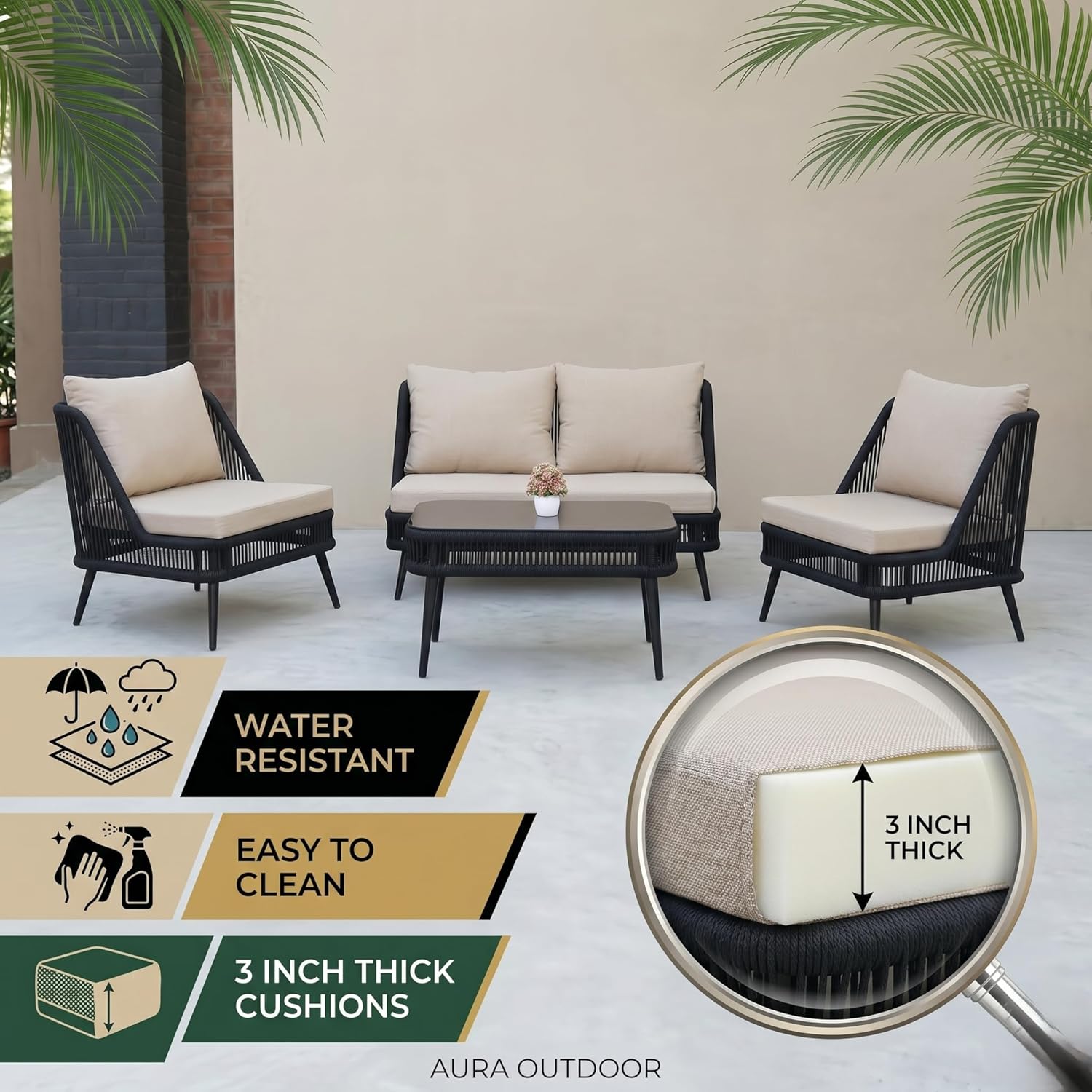 LOCCUS 4-Piece Outdoor Rope Sofa Set, All-Weather Cushions & Glass Top Table