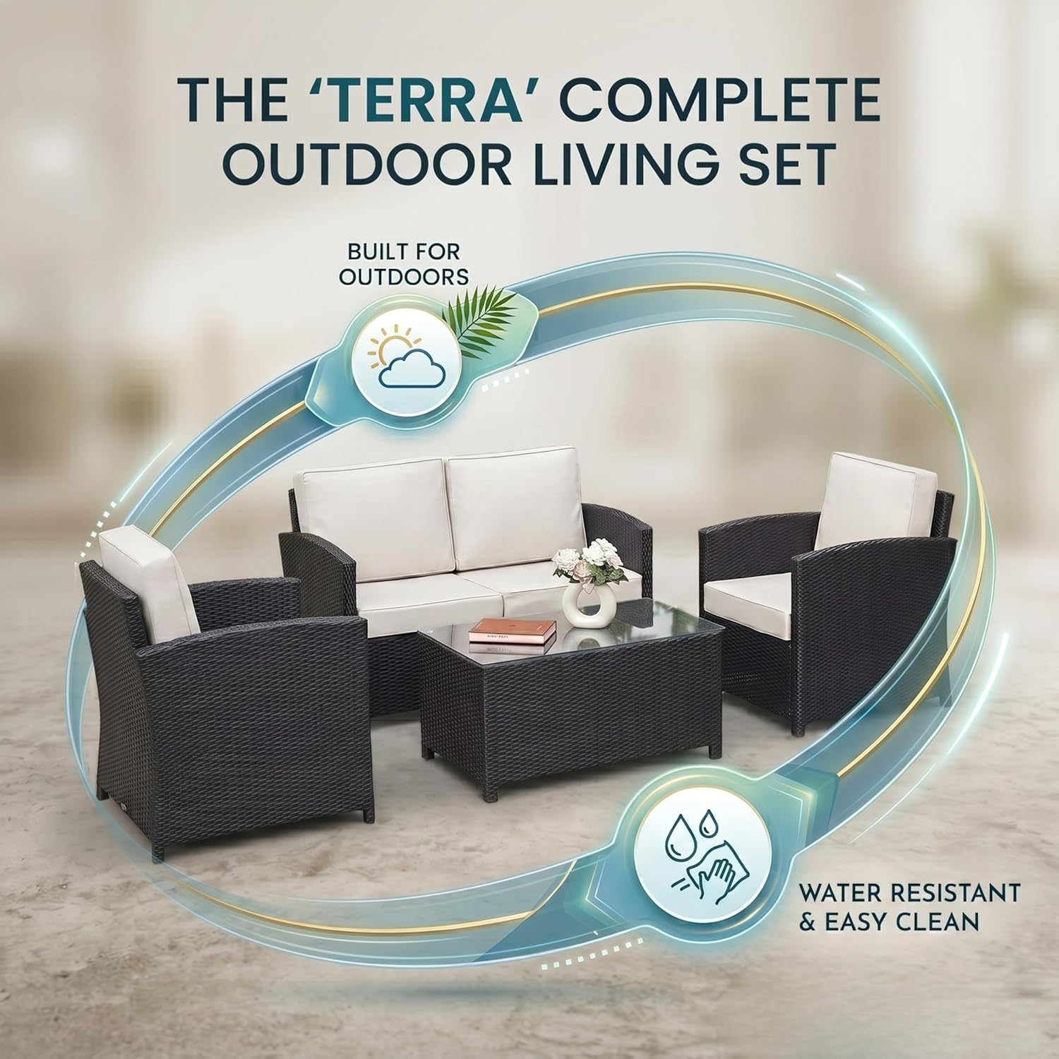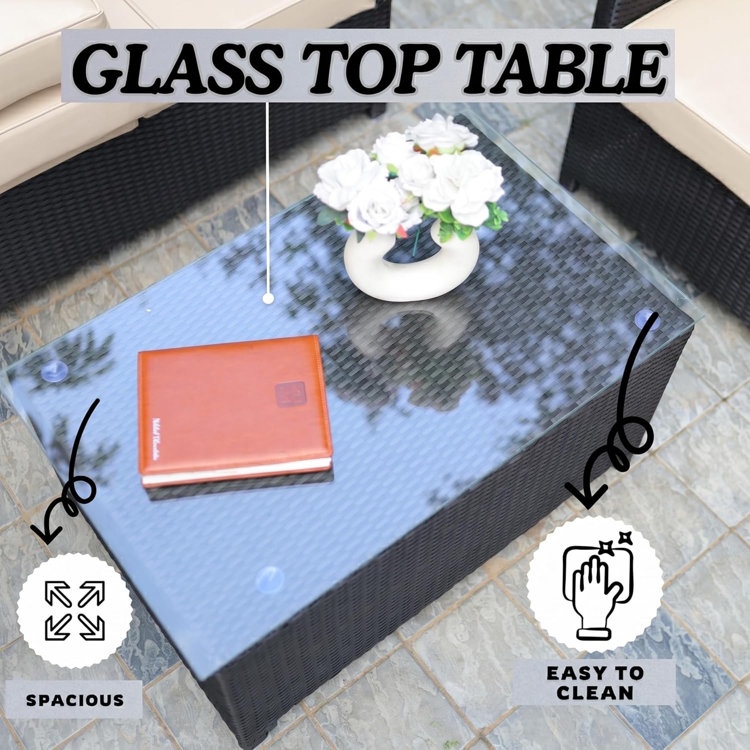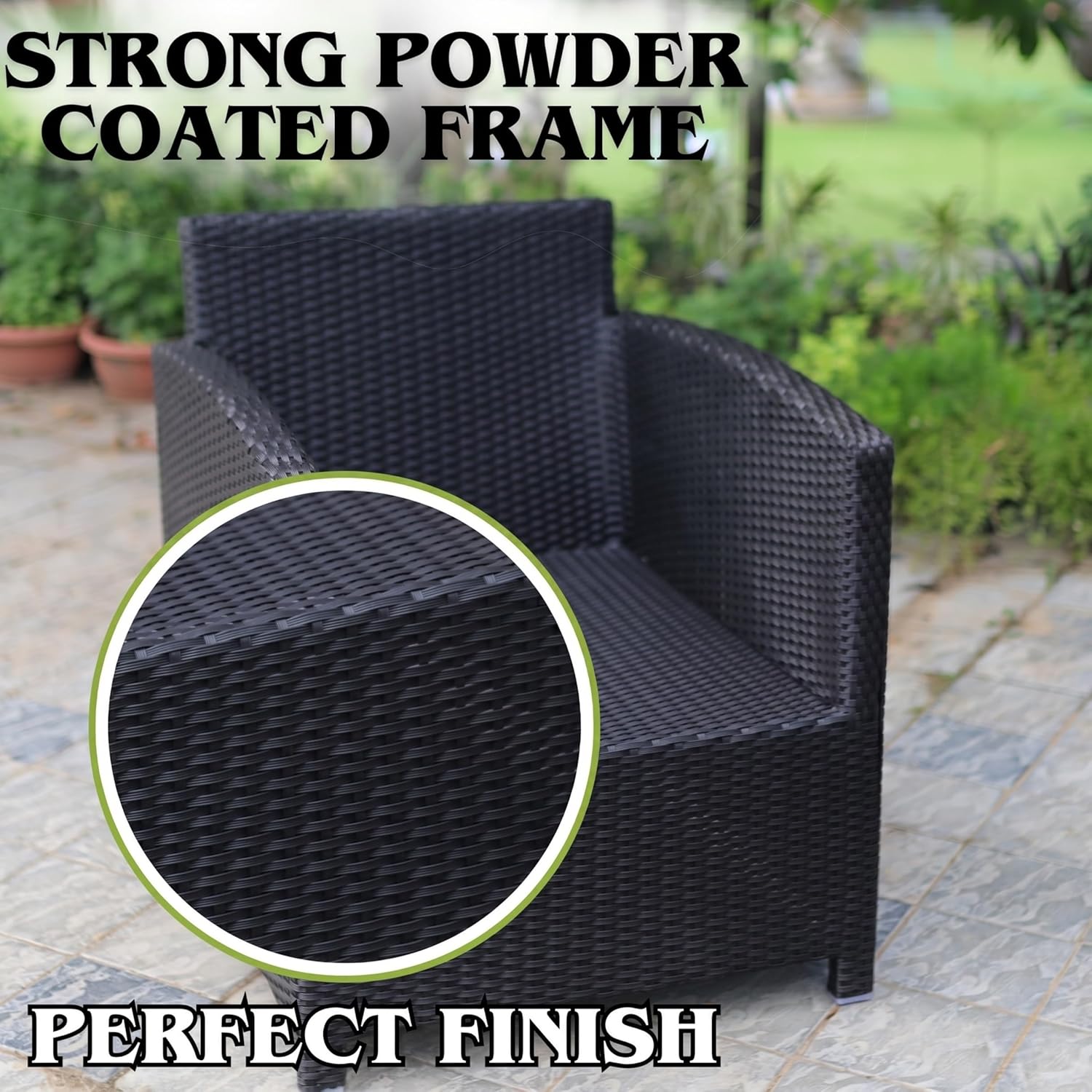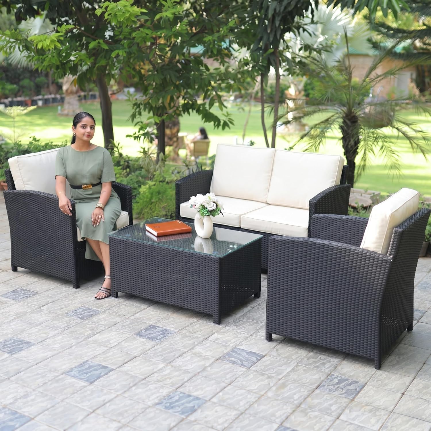 Upgrade your outdoor living space with this stylish and comfortable patio furniture set, expertly crafted with handwoven HDPE rattan for a modern and elegant look. Designed for superior comfort, it features thick, waterproof cushions and supportive backrests, allowing you to relax for hours. The sturdy powder-coated iron frame ensures long-lasting durability, making it perfect for all weather conditions, from sunny days to rainy evenings. This complete set includes a spacious double seater, two single chairs, and a sleek center table with a smooth glass top, ideal for hosting guests or enjoying family time. Easy to maintain and versatile in use, this furniture set is perfect for patios, balconies, gardens, poolside areas, or even indoor spaces. Handcrafted by skilled artisans, each piece is unique and designed to add both comfort and style to your home.