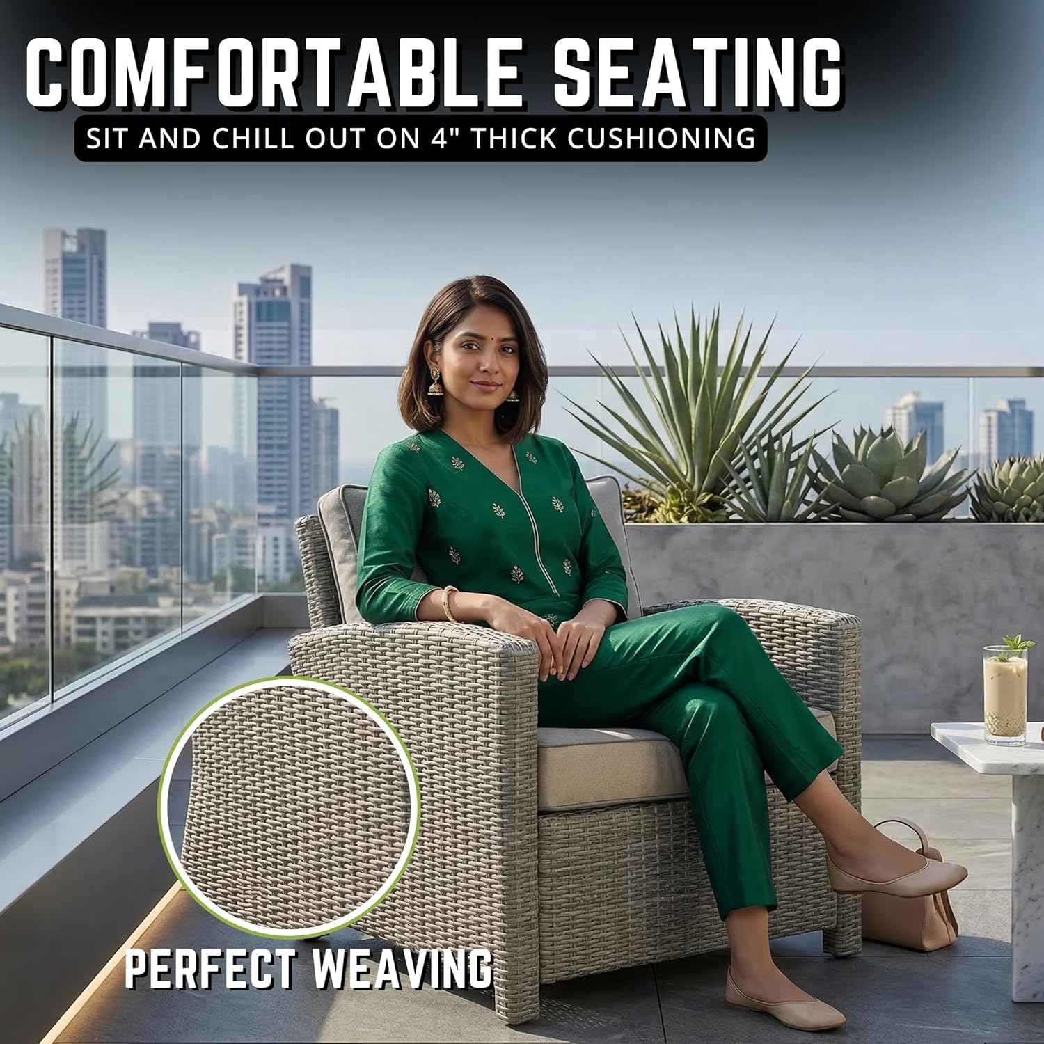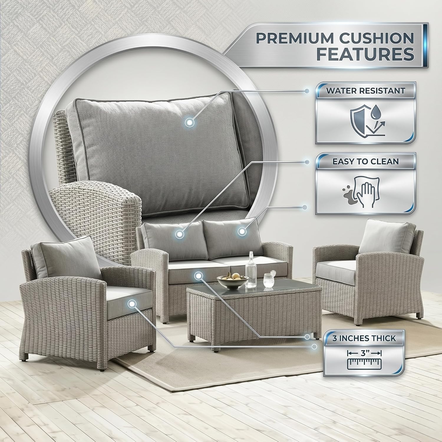 • MODERN COMFORT: Experience the ultimate in relaxation with this low back, deep seating modern rattan set that lets you sink into comfort. This trendy, low profile set features thick back and seat cushions and cozy throw pillows that further add to the contemporary luxury of this set.
