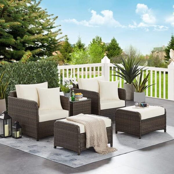 - Luxurious and appealing : Loccus’ 5-piece patio furniture set includes 2 single chairs, 2 ottomans, and 1 coffee table. Chairs are ergonomically designed for more comfort with soft, sponge-padded cushions. Large ottomans provide you with a comfortable place to rest.