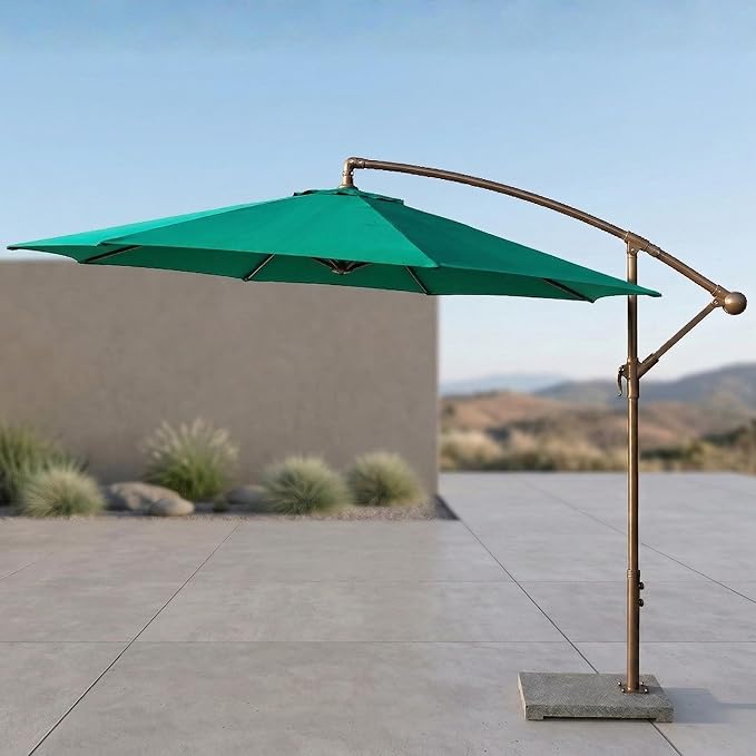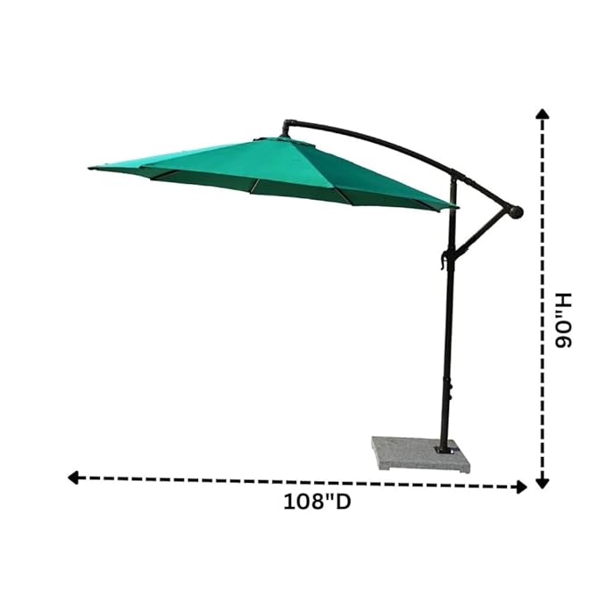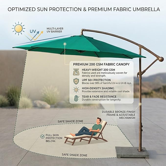 • 9 FT offset hanging umbrella with a side-mounted pole provides flexible positioning and wide shade coverage—no centre pole obstruction, ideal for outdoor seating, patios, and gardens.