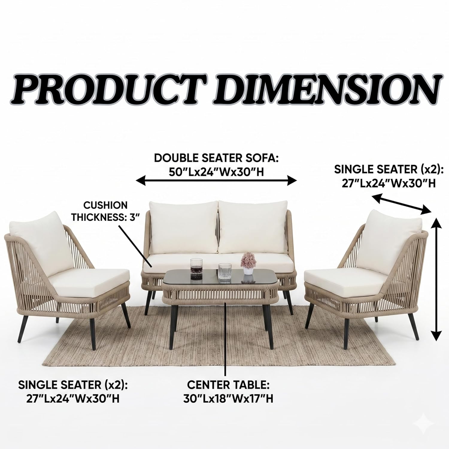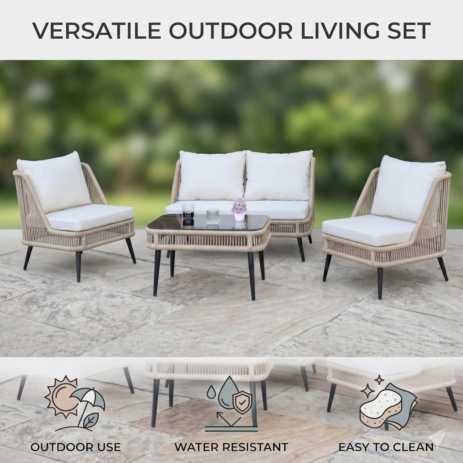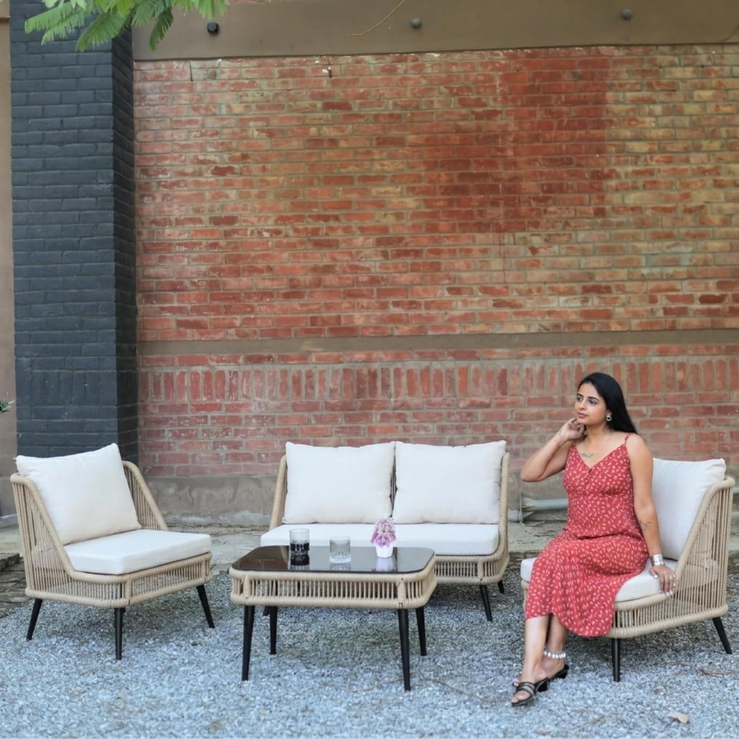 Upgrade your outdoor living with this stylish and durable 4-seater rope sofa set, thoughtfully designed for comfort, functionality, and modern aesthetics. Perfect for gardens, patios, balconies, and poolside settings, this elegant furniture set blends premium materials with practical design to enhance your everyday relaxation experience. Crafted with a powder-coated metal frame, this outdoor set ensures exceptional strength, rust resistance, and long-lasting durability even in changing weather conditions. Despite its sturdy build, the frame remains lightweight, allowing you to easily rearrange your setup whenever needed. The seating features breathable rope weaving, offering ergonomic support while adding a contemporary touch to your space. The UV-resistant rope material is designed to withstand outdoor conditions, maintaining its look and performance over time without fading or wear. For superior comfort, the set comes with soft, thick water-repellent cushions that are perfect for all-weather use. These cushions are easy to clean, quick-drying, and designed to provide a cozy seating experience for daily lounging. The neutral beige and cream color combination adds a sophisticated and calming vibe to any outdoor décor. Complementing the seating is an elegant glass-top center table, providing a smooth and stable surface for drinks, snacks, or decorative items. Its sleek design enhances the overall look while being easy to maintain. Designed with space efficiency in mind, this 4-seater configuration includes a double seater, two single chairs, and a center table—making it ideal for both compact and spacious outdoor areas. Whether you’re hosting guests or enjoying quiet moments, this set adapts effortlessly to your needs.