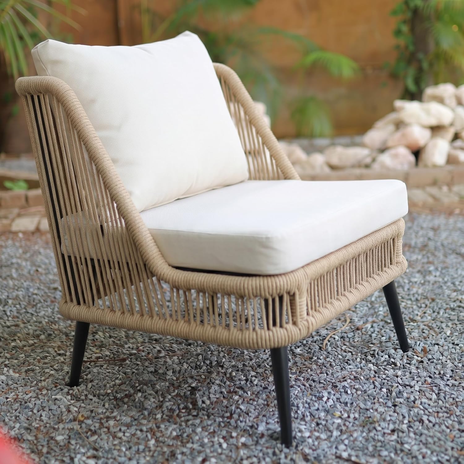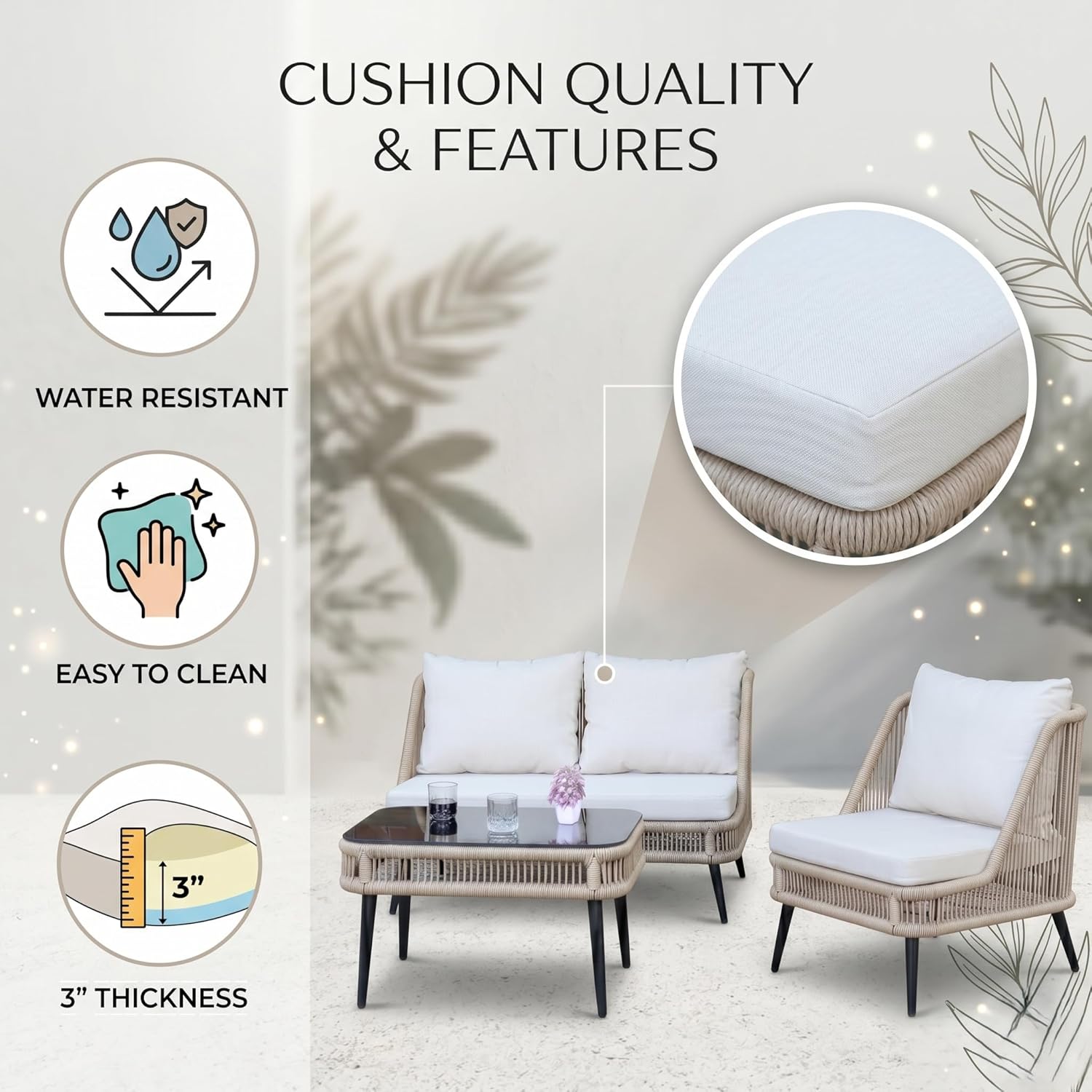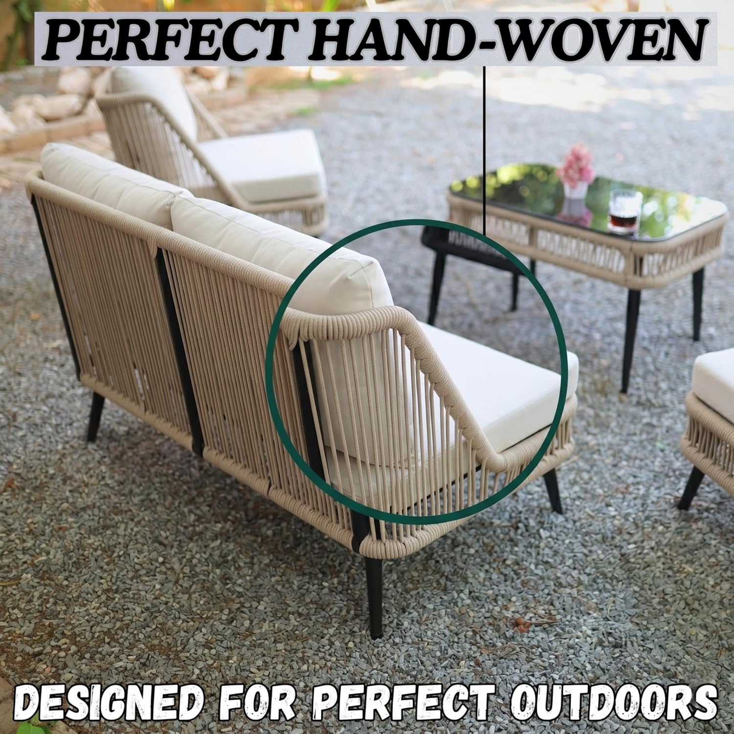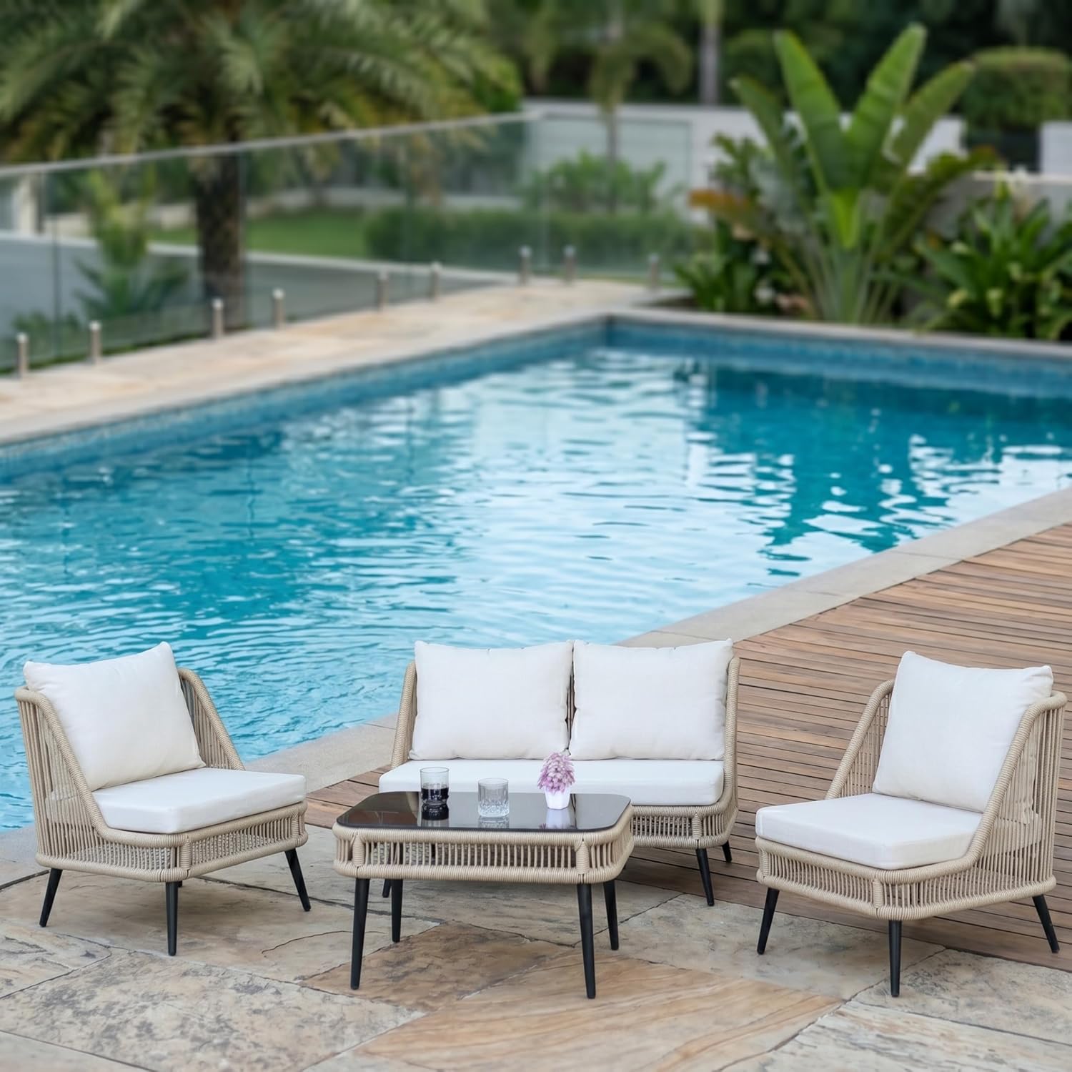Upgrade your outdoor living with this stylish and durable 4-seater rope sofa set, thoughtfully designed for comfort, functionality, and modern aesthetics. Perfect for gardens, patios, balconies, and poolside settings, this elegant furniture set blends premium materials with practical design to enhance your everyday relaxation experience. Crafted with a powder-coated metal frame, this outdoor set ensures exceptional strength, rust resistance, and long-lasting durability even in changing weather conditions. Despite its sturdy build, the frame remains lightweight, allowing you to easily rearrange your setup whenever needed. The seating features breathable rope weaving, offering ergonomic support while adding a contemporary touch to your space. The UV-resistant rope material is designed to withstand outdoor conditions, maintaining its look and performance over time without fading or wear. For superior comfort, the set comes with soft, thick water-repellent cushions that are perfect for all-weather use. These cushions are easy to clean, quick-drying, and designed to provide a cozy seating experience for daily lounging. The neutral beige and cream color combination adds a sophisticated and calming vibe to any outdoor décor. Complementing the seating is an elegant glass-top center table, providing a smooth and stable surface for drinks, snacks, or decorative items. Its sleek design enhances the overall look while being easy to maintain. Designed with space efficiency in mind, this 4-seater configuration includes a double seater, two single chairs, and a center table—making it ideal for both compact and spacious outdoor areas. Whether you’re hosting guests or enjoying quiet moments, this set adapts effortlessly to your needs.