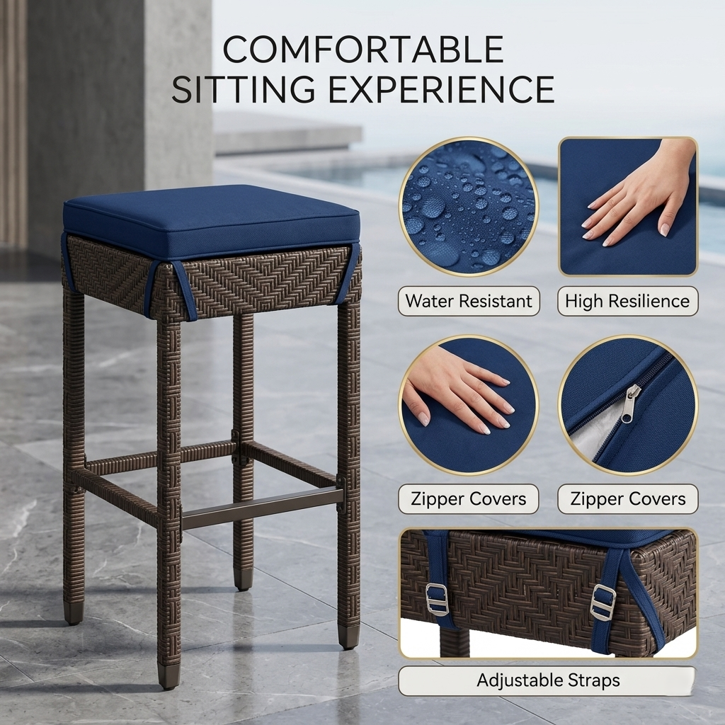 Each bar stool is thoughtfully designed with a built-in footrest for added comfort. The armless structure allows flexible seating positions, while adjustable anti-slip foot pads ensure balance even on uneven surfaces.