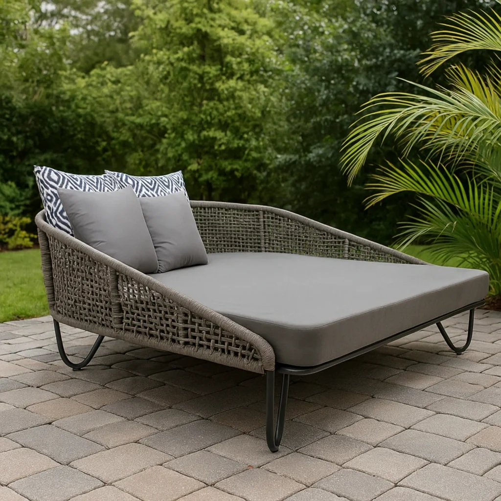 “Upgrade your outdoor living with this stylish rope daybed, crafted with a durable powder-coated iron frame and 100% handwoven rope. Featuring soft, waterproof, sun-resistant cushions and cozy pillows, this outdoor rope furniture is perfect for patio, garden, balcony, poolside, or backyard relaxation. All-weather design, breathable fabric, and removable covers ensure comfort, durability, and easy maintenance.”