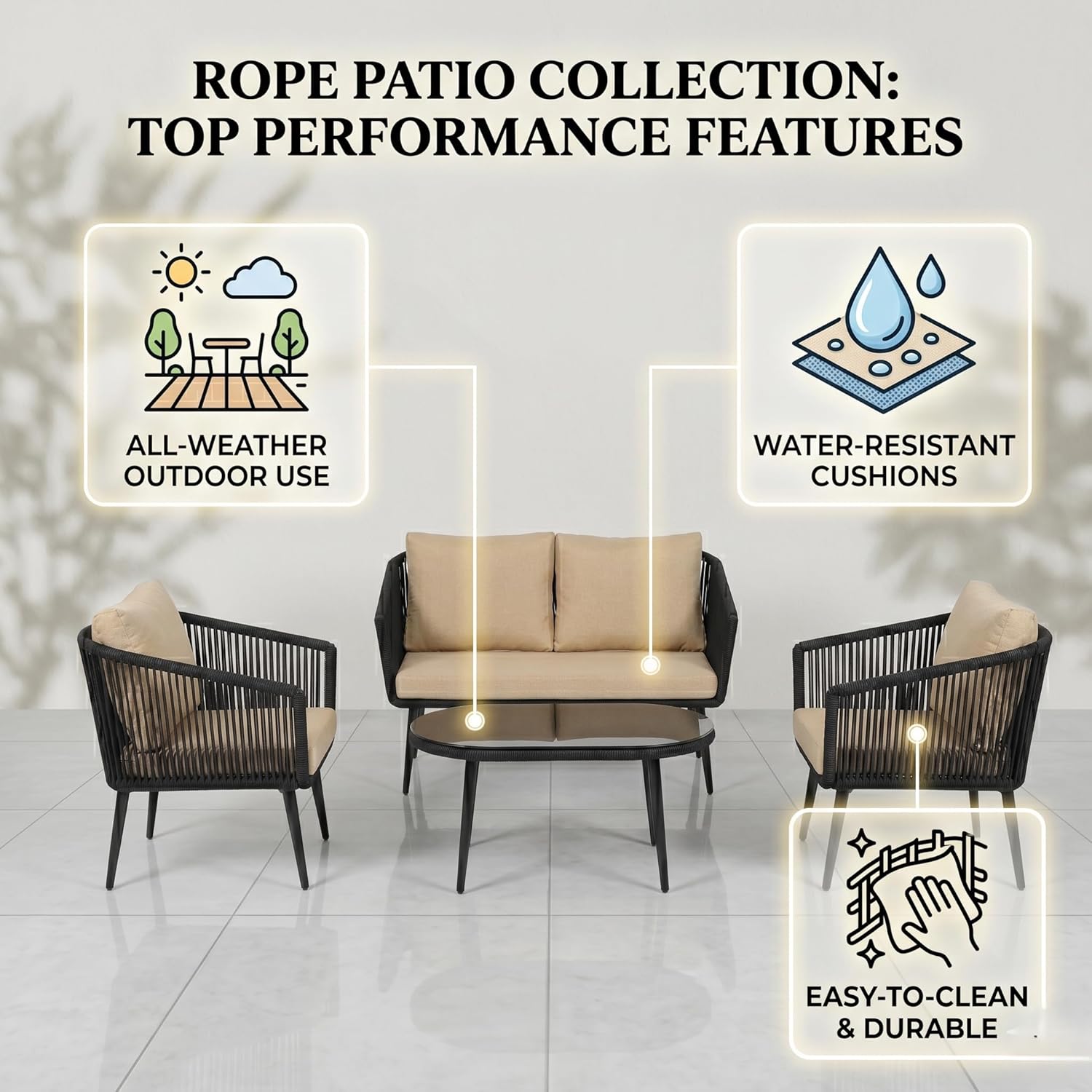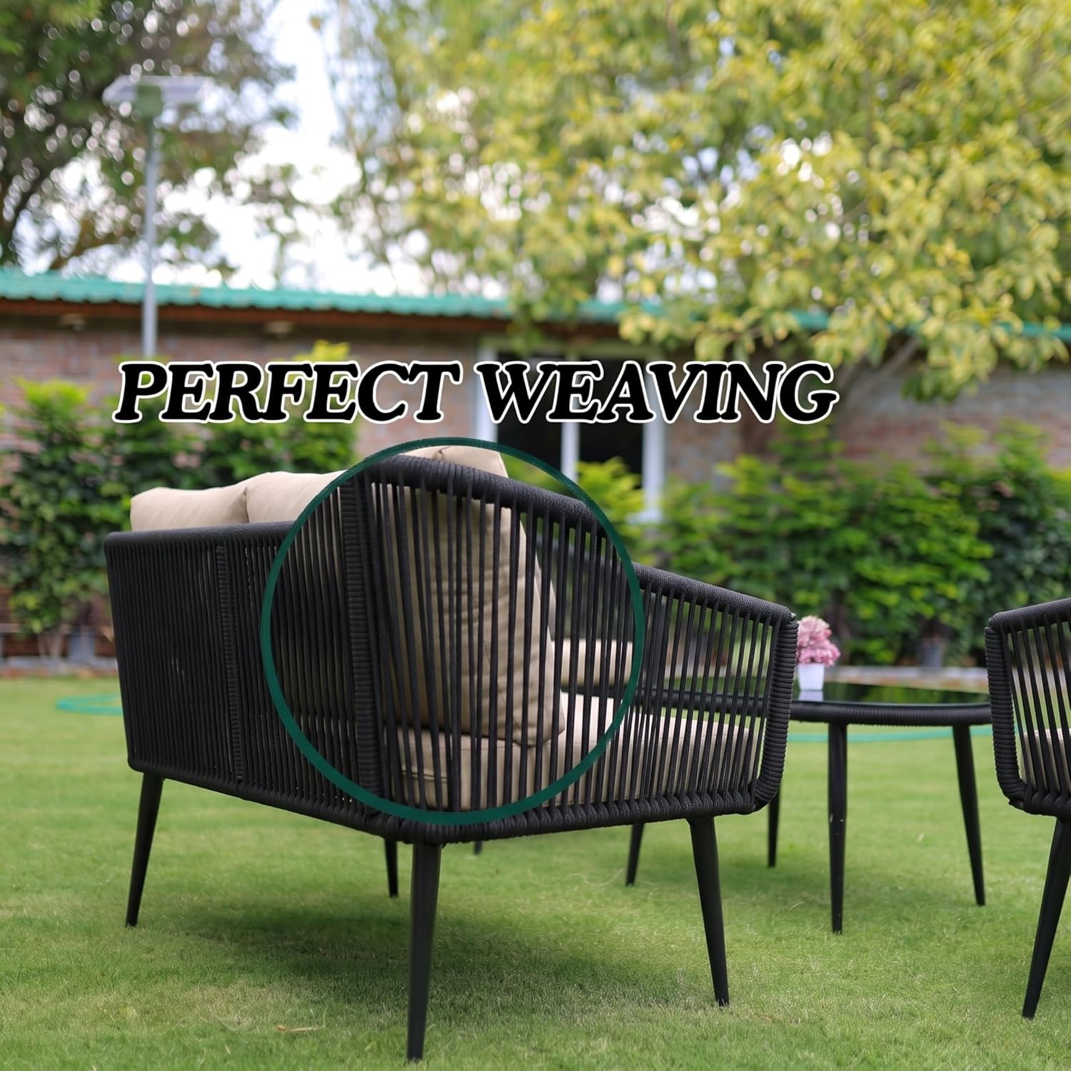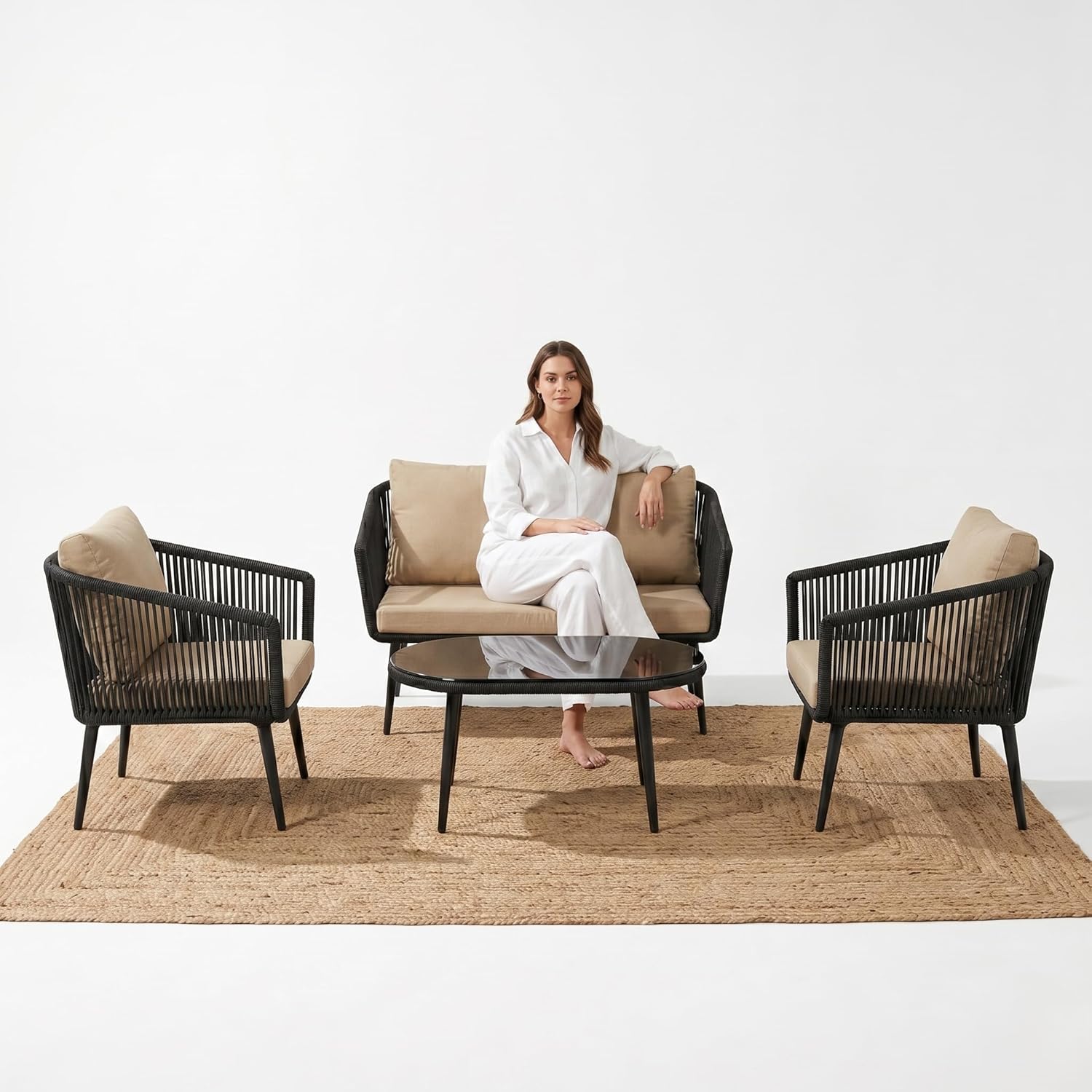 LOCCUS Outdoor Rope 4-Seater Sofa Set with Glass Top Table