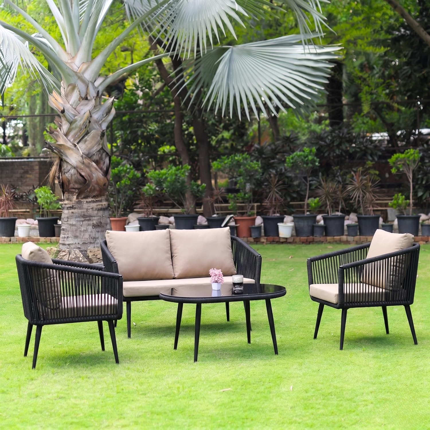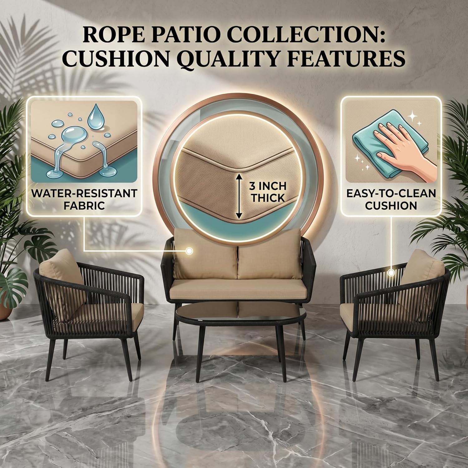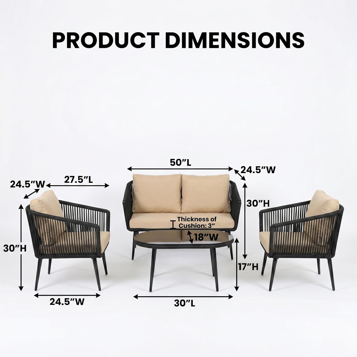 LOCCUS Outdoor Rope 4-Seater Sofa Set with Glass Top Table