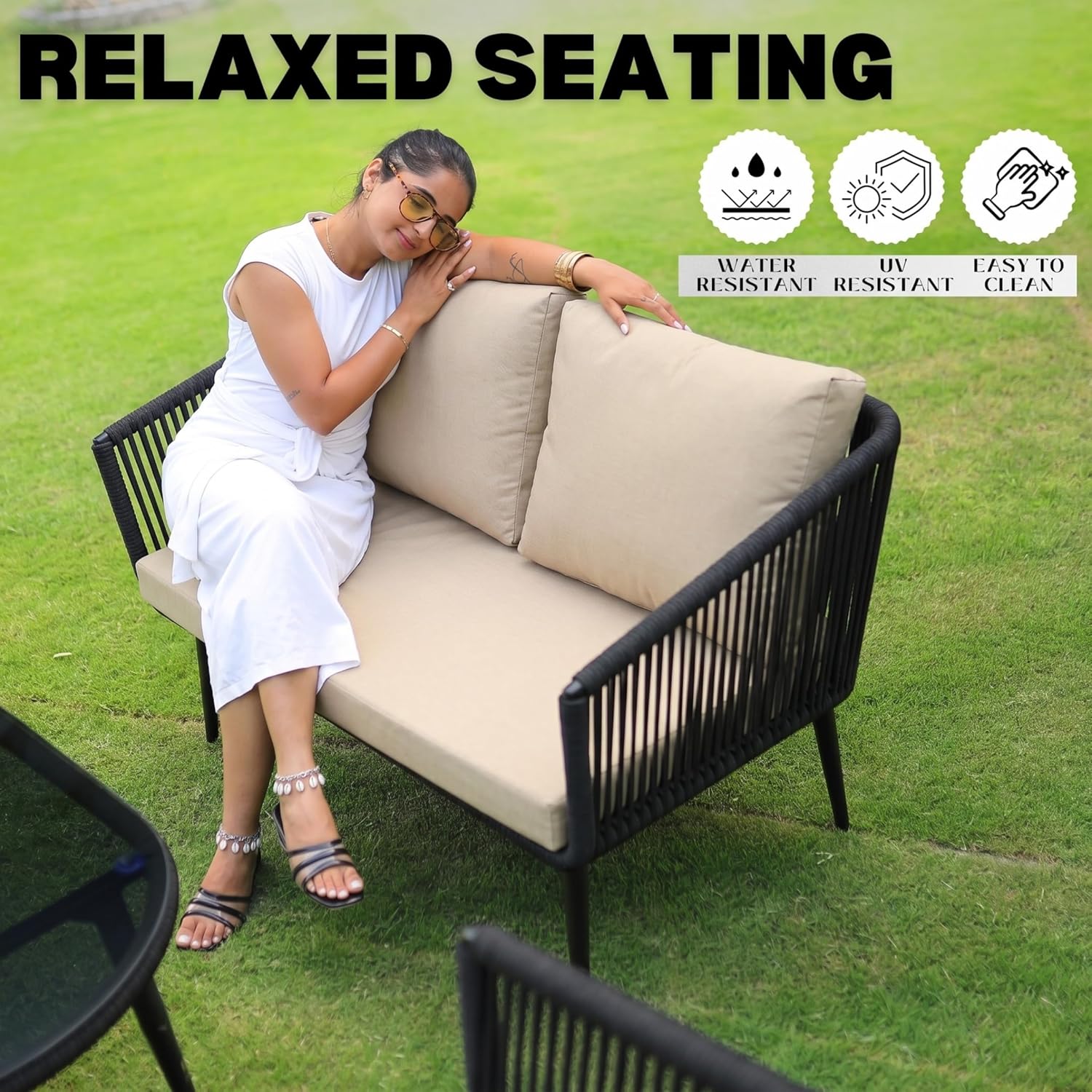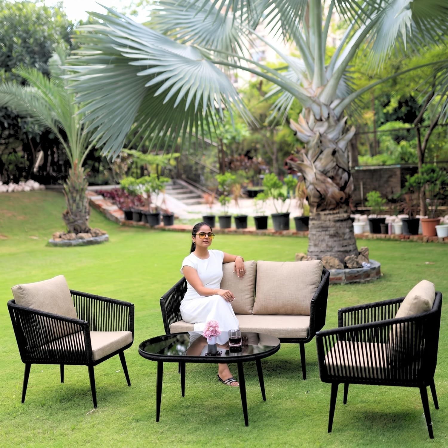 • Space-Saving 4-Seater Outdoor Set: Smart 4-seater configuration includes a double seater sofa, two single chairs, and a center table—perfect for small balconies, terraces, gardens, patios, and poolside areas.