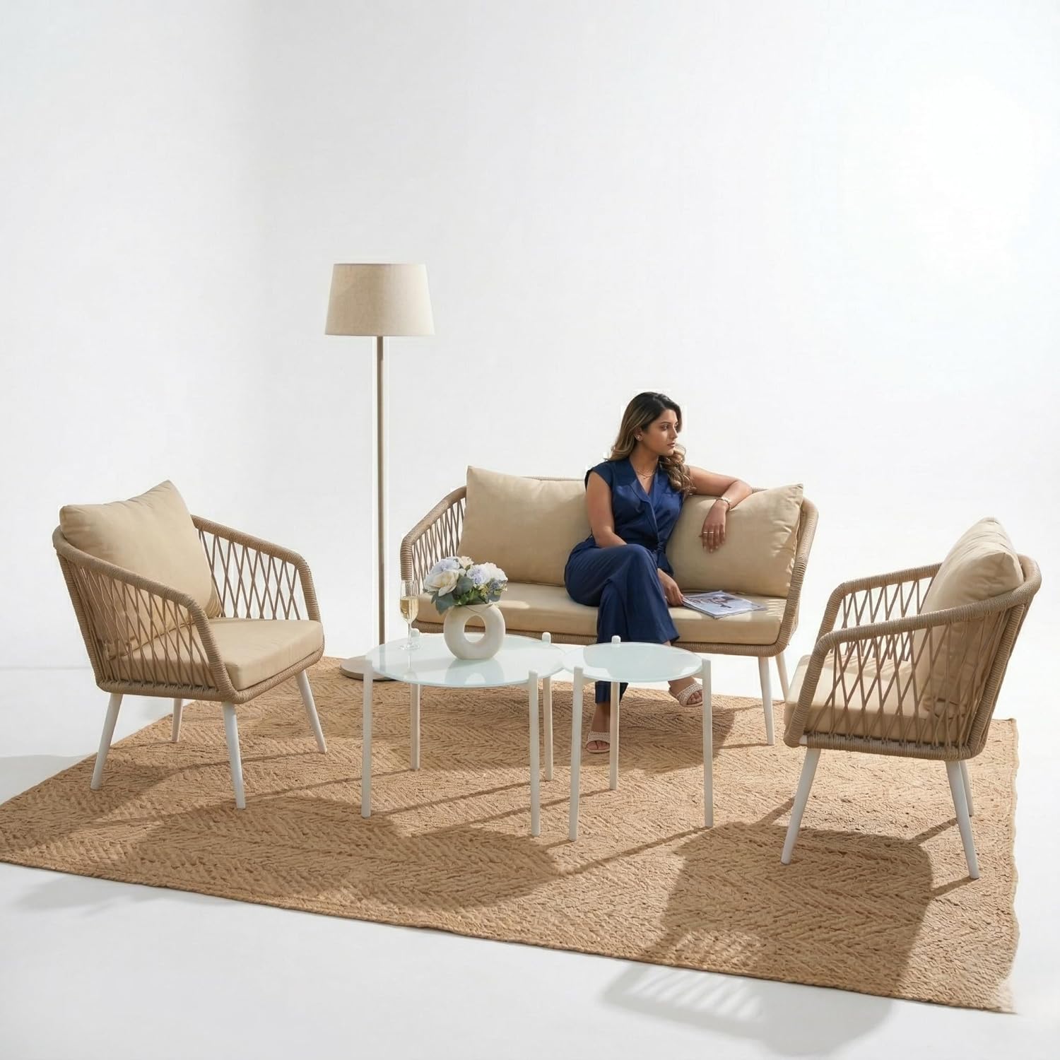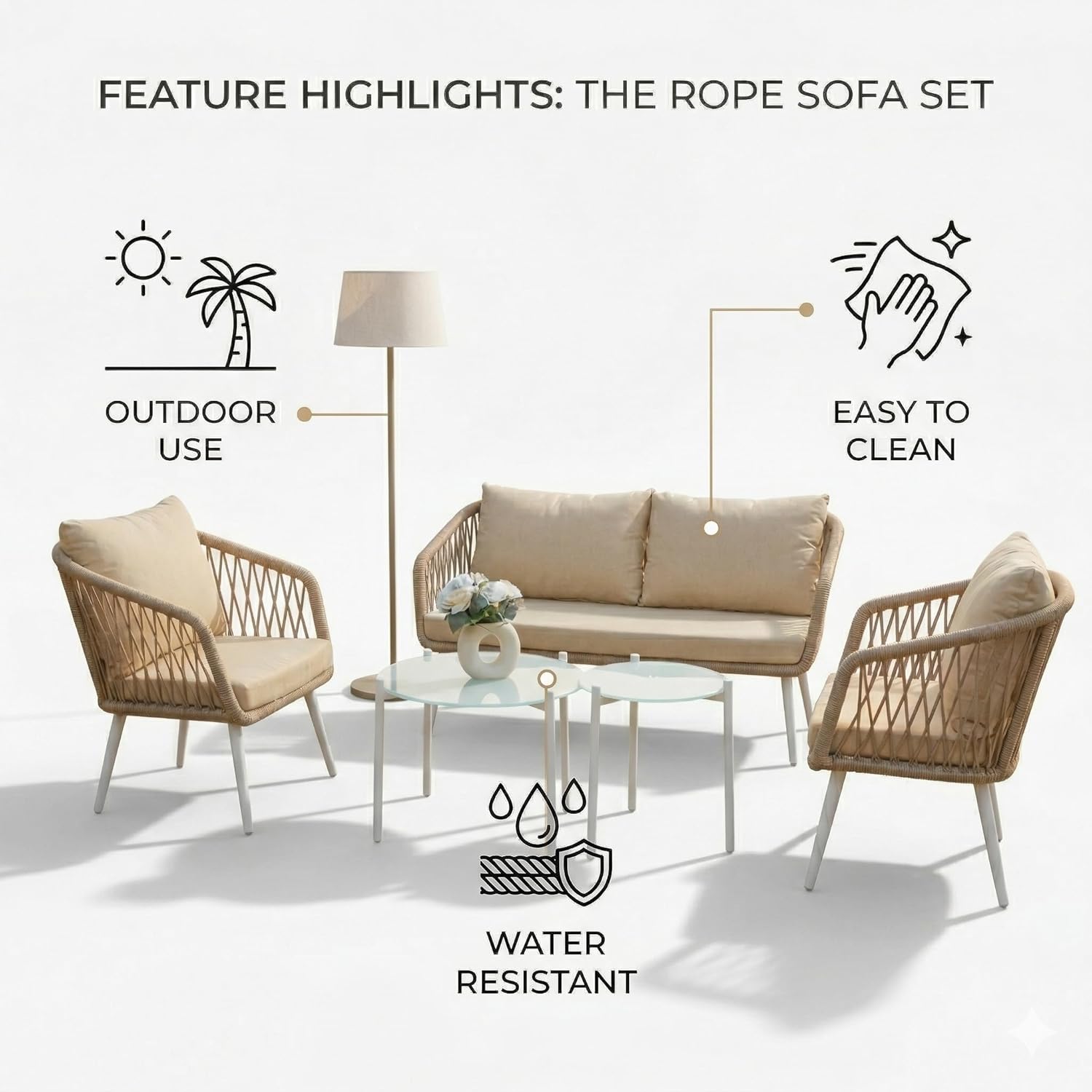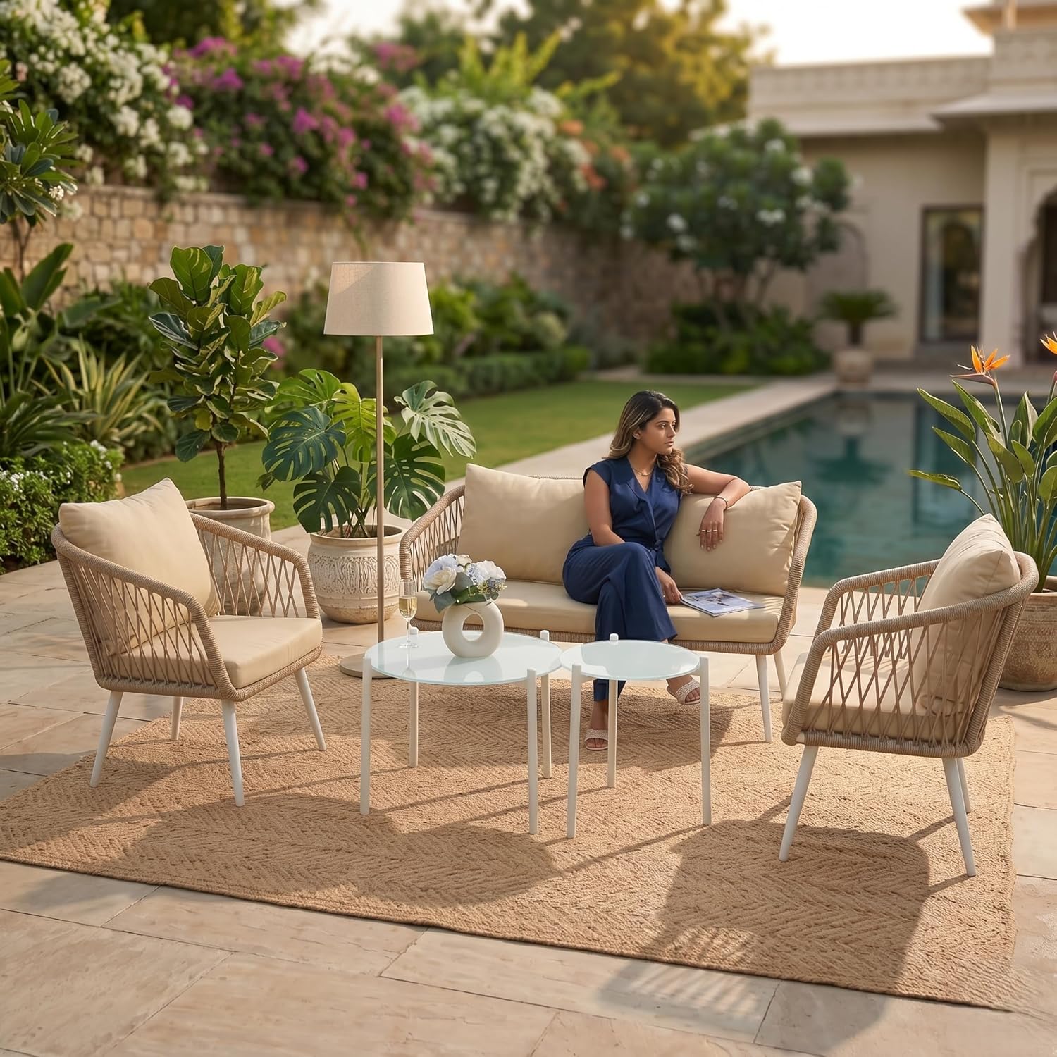 Upgrade your outdoor living with this stylish and durable 4-seater rope sofa set, thoughtfully designed for comfort, functionality, and modern aesthetics. Perfect for gardens, patios, balconies, and poolside settings, this elegant furniture set blends premium materials with practical design to enhance your everyday relaxation experience. Crafted with a powder-coated metal frame, this outdoor set ensures exceptional strength, rust resistance, and long-lasting durability even in changing weather conditions. Despite its sturdy build, the frame remains lightweight, allowing you to easily rearrange your setup whenever needed. The seating features breathable rope weaving, offering ergonomic support while adding a contemporary touch to your space. The UV-resistant rope material is designed to withstand outdoor conditions, maintaining its look and performance over time without fading or wear. For superior comfort, the set comes with soft, thick water-repellent cushions that are perfect for all-weather use. These cushions are easy to clean, quick-drying, and designed to provide a cozy seating experience for daily lounging. The neutral beige and cream color combination adds a sophisticated and calming vibe to any outdoor décor. Complementing the seating is an elegant glass-top center table, providing a smooth and stable surface for drinks, snacks, or decorative items. Its sleek design enhances the overall look while being easy to maintain. Designed with space efficiency in mind, this 4-seater configuration includes a double seater, two single chairs, and a center table—making it ideal for both compact and spacious outdoor areas. Whether you’re hosting guests or enjoying quiet moments, this set adapts effortlessly to your needs.