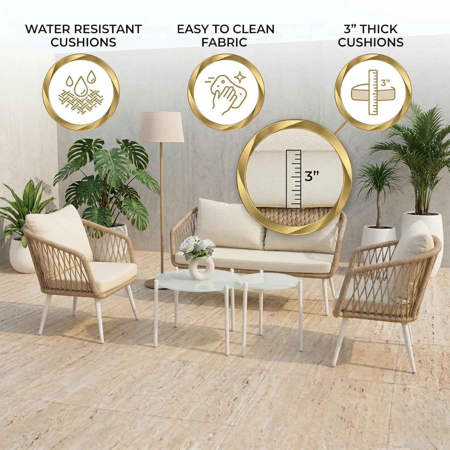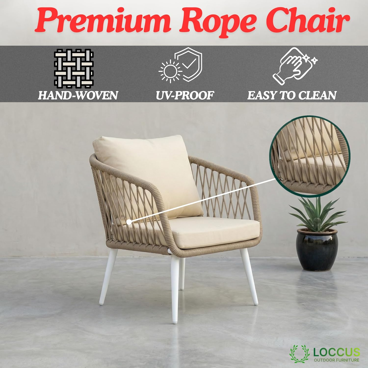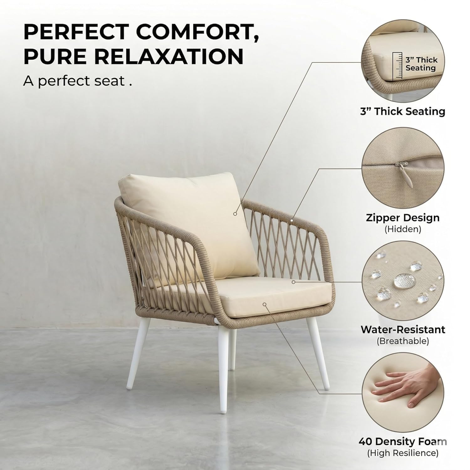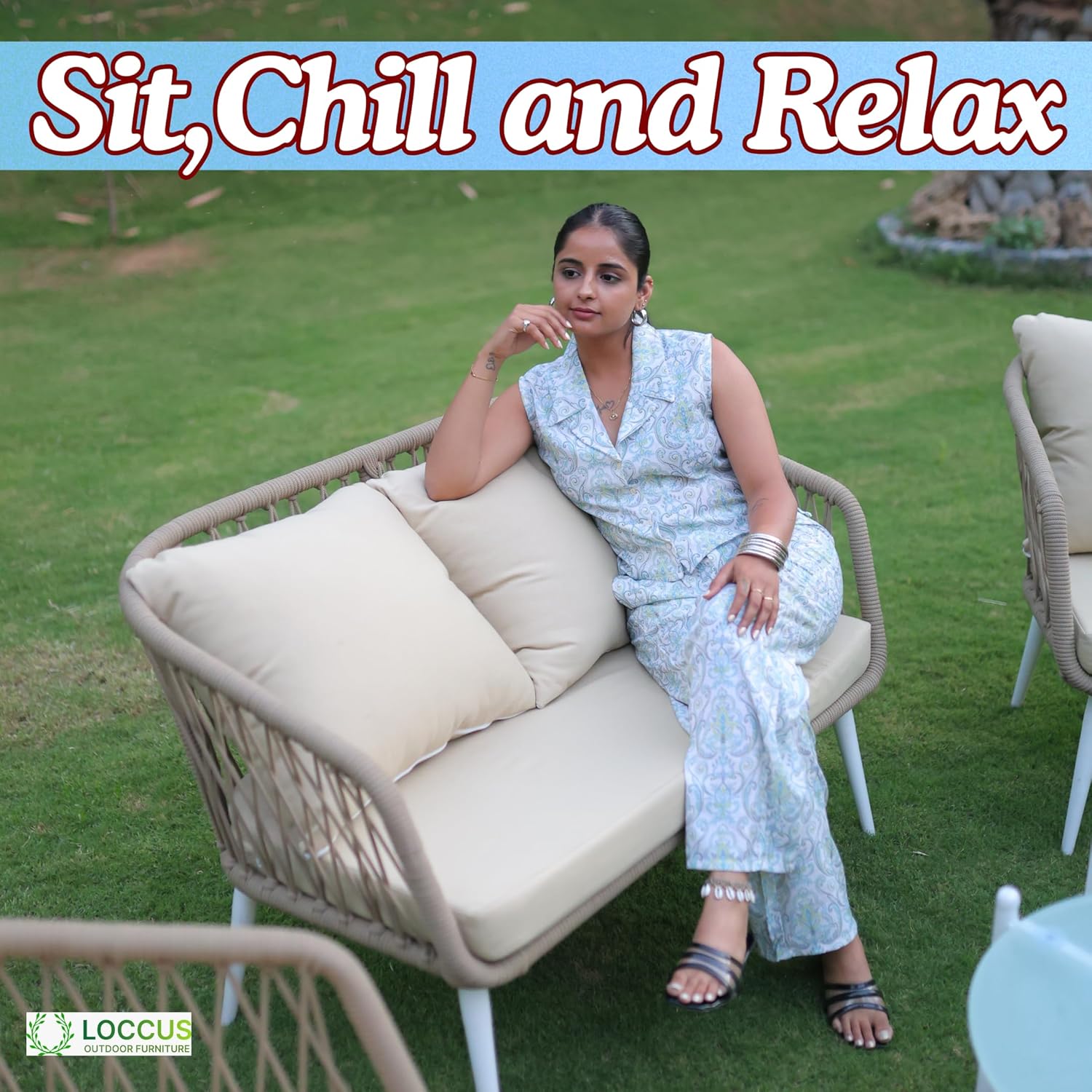 Upgrade your outdoor living with this stylish and durable 4-seater rope sofa set, thoughtfully designed for comfort, functionality, and modern aesthetics. Perfect for gardens, patios, balconies, and poolside settings, this elegant furniture set blends premium materials with practical design to enhance your everyday relaxation experience. Crafted with a powder-coated metal frame, this outdoor set ensures exceptional strength, rust resistance, and long-lasting durability even in changing weather conditions. Despite its sturdy build, the frame remains lightweight, allowing you to easily rearrange your setup whenever needed. The seating features breathable rope weaving, offering ergonomic support while adding a contemporary touch to your space. The UV-resistant rope material is designed to withstand outdoor conditions, maintaining its look and performance over time without fading or wear. For superior comfort, the set comes with soft, thick water-repellent cushions that are perfect for all-weather use. These cushions are easy to clean, quick-drying, and designed to provide a cozy seating experience for daily lounging. The neutral beige and cream color combination adds a sophisticated and calming vibe to any outdoor décor. Complementing the seating is an elegant glass-top center table, providing a smooth and stable surface for drinks, snacks, or decorative items. Its sleek design enhances the overall look while being easy to maintain. Designed with space efficiency in mind, this 4-seater configuration includes a double seater, two single chairs, and a center table—making it ideal for both compact and spacious outdoor areas. Whether you’re hosting guests or enjoying quiet moments, this set adapts effortlessly to your needs.