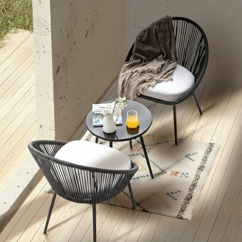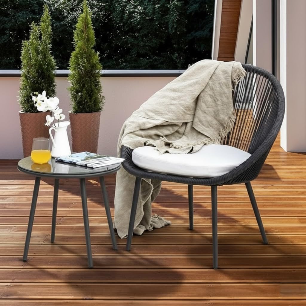Create your ultimate outdoor relaxation corner with the LOCCUS 3-Piece Outdoor Patio Furniture Set. This elegant set features 2 rope-style chairs and 1 compact table, designed for balconies, terraces, gardens, or patios. The chairs’ ergonomic design ensures comfort while the rope weaving adds a modern, stylish touch. Built from durable, weather-resistant materials, this set can withstand sun, rain, and daily outdoor use. The grey and off-white color combination complements any outdoor décor, while the compact table is perfect for holding drinks, snacks, or decorative items. Whether enjoying a morning coffee or hosting a casual conversation, this patio set combines style, comfort, and functionality for your outdoor space.
