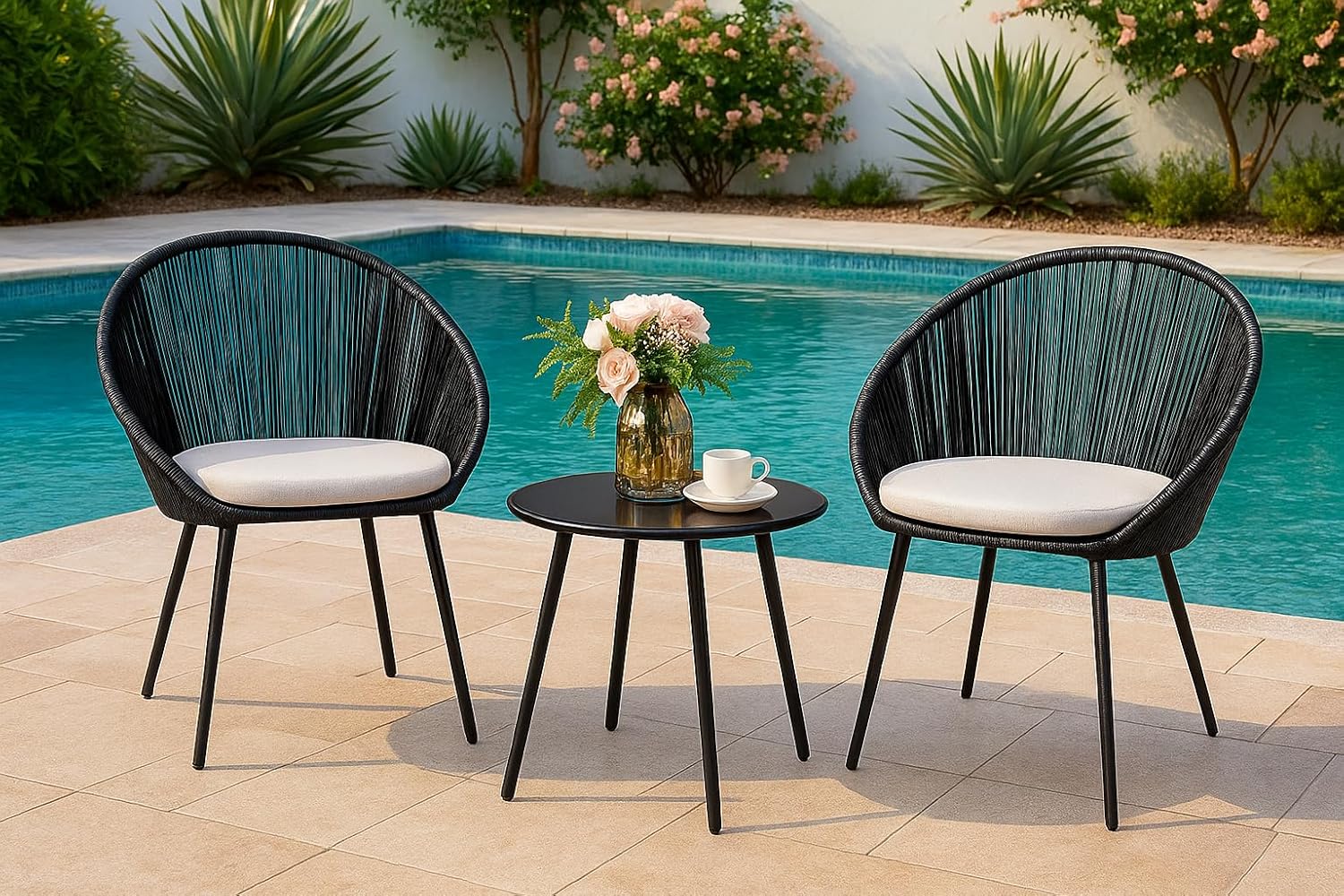 Each chair includes soft off-white cushions that provide excellent comfort and support. Made with durable materials, the cushions are designed to withstand outdoor conditions while maintaining comfort and style.