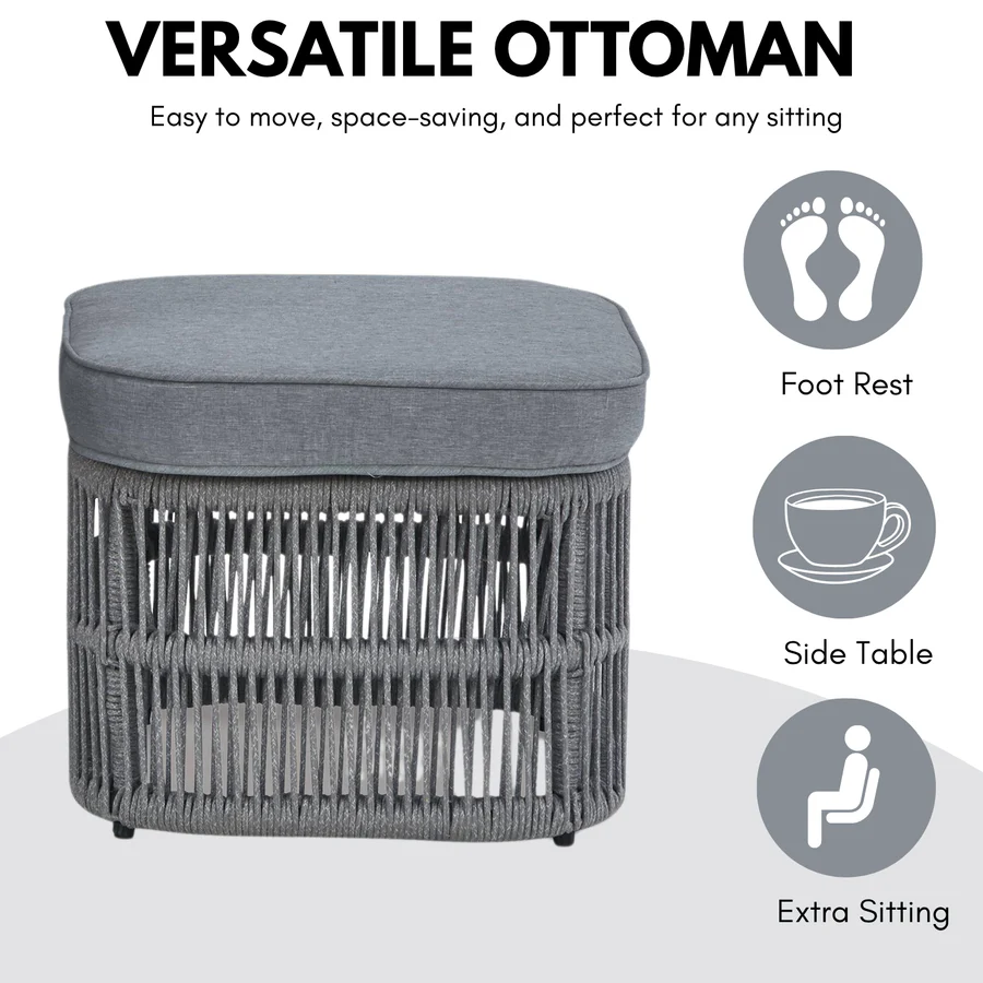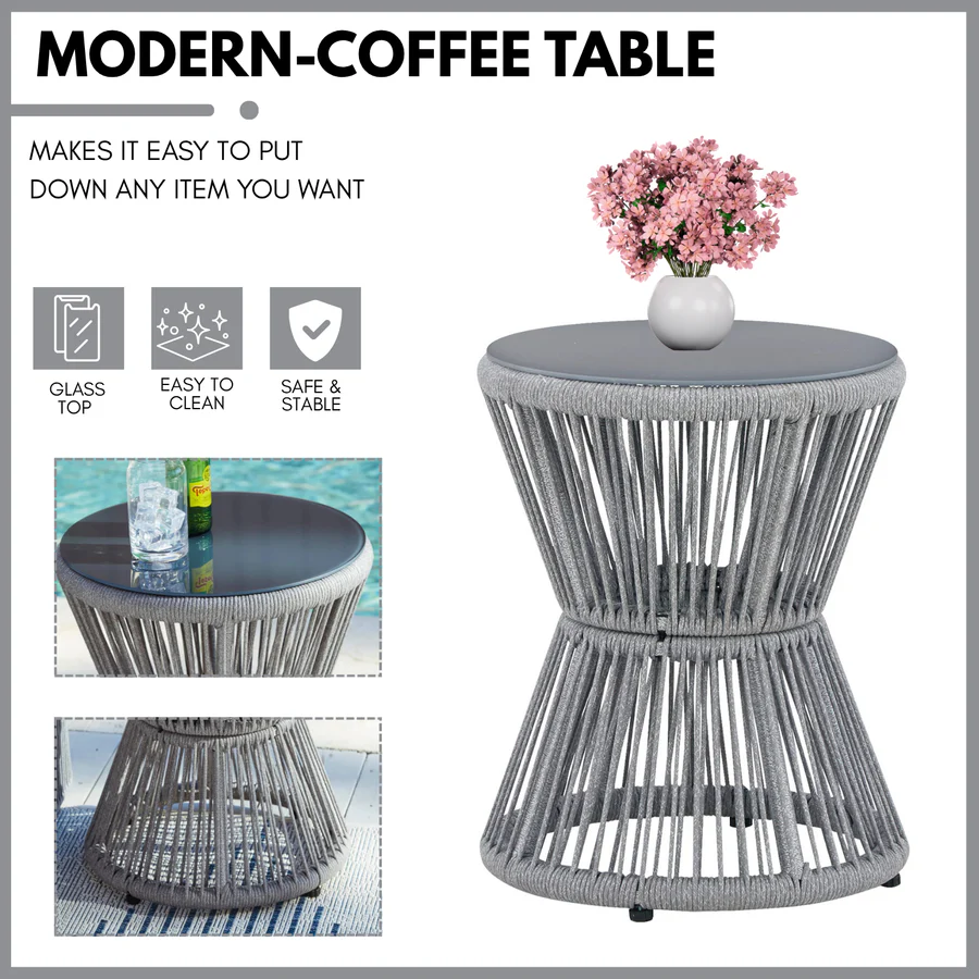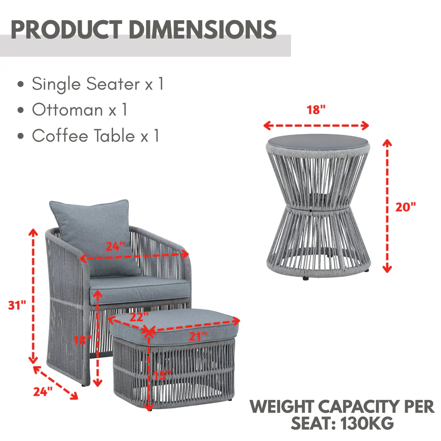 Create your personal sanctuary of style and comfort with this 3 Piece Rope Conversation Patio Set, thoughtfully designed to enhance any indoor or outdoor space. Whether it’s your balcony, garden, backyard, terrace, or sunroom, this versatile set transforms any corner into a relaxing retreat. Crafted with a modern grey finish, this elegant ensemble includes one armchair, one matching ottoman, and a sleek glass top coffee table. The frame is constructed from durable powder-coated metal for long-lasting stability, while the handwoven all-weather rope offers superior strength, breathability, and visual appeal.