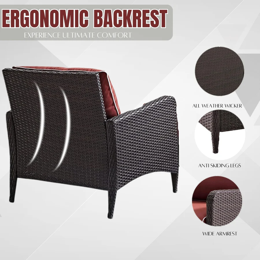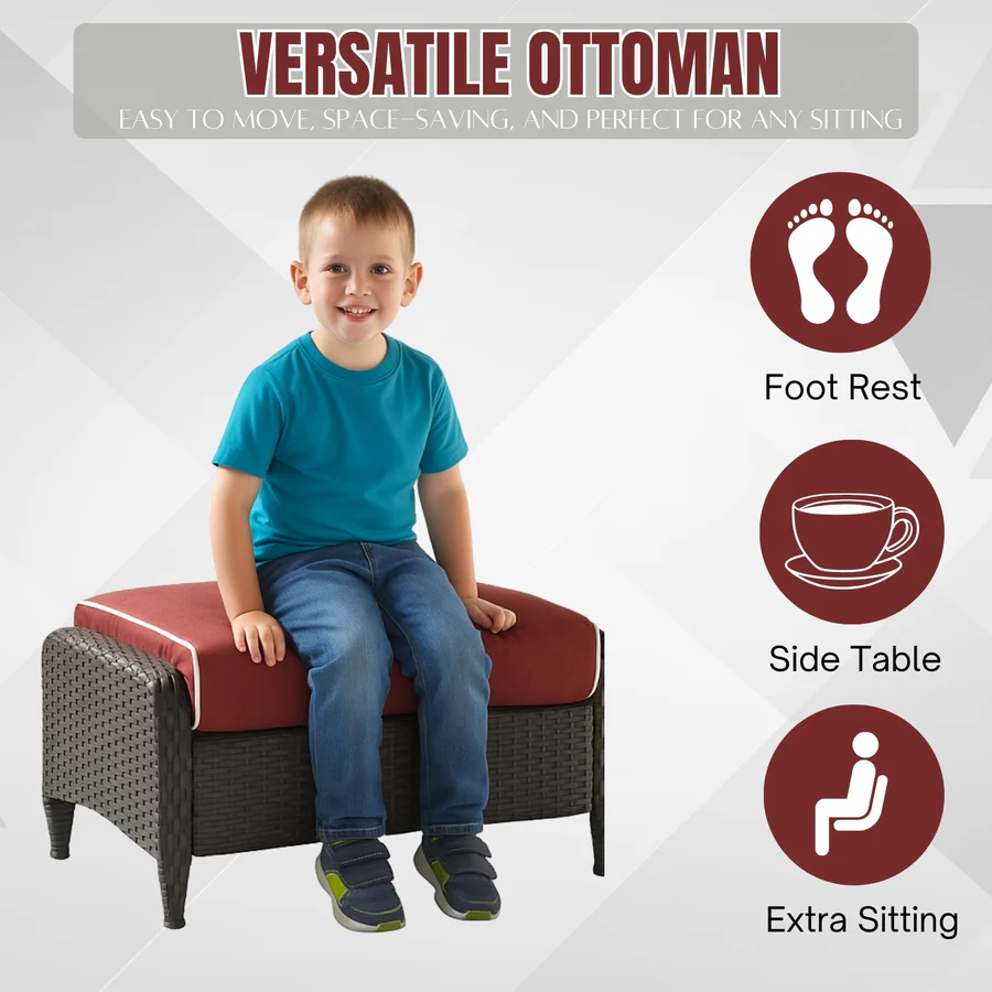 Turn your outdoor space into a cozy retreat with this elegant 4-Piece Patio Furniture Conversation Set. Designed to combine comfort, style, and durability, this bistro-style set is perfect for everything from casual lounging to evening get-togethers. Crafted with premium handwoven all-weather wicker in a rich dark brown finish, it seamlessly complements outdoor décors while withstanding sun, rain, and daily wear. The set includes two cushioned armchairs & two versatile ottomans. The red-colored cushions add a refreshing contrast and are filled with thick, high-density foam to provide cloud-like relaxation. The removable cushion covers are easy to clean, making maintenance a breeze. Whether you’re sipping morning coffee on your porch or entertaining guests by the pool, the ergonomic design of the chairs and the added footrests ensure a perfect balance of luxury and function.