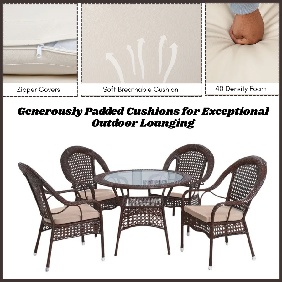 Elevate your patio, garden, or balcony with the Outdoor All-Weather Resistant Rattan Wicker 5-Piece Dining Set in White—a perfect blend of durability, elegance, and everyday functionality. Crafted with premium handwoven rattan wicker and a rust-resistant powder-coated metal frame, this dining set is built to withstand all weather conditions—be it rain, sun, or humidity—making it ideal for year-round outdoor use. This stylish set includes one spacious dining table with a smooth, glass top for easy cleaning and four ergonomically designed chairs that deliver lasting comfort. Whether you’re enjoying a quiet morning coffee or hosting a weekend brunch, this set offers a welcoming spot for every occasion.