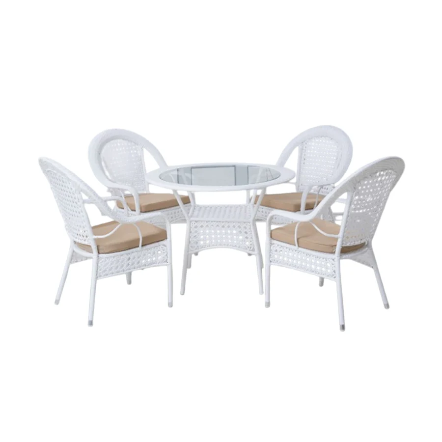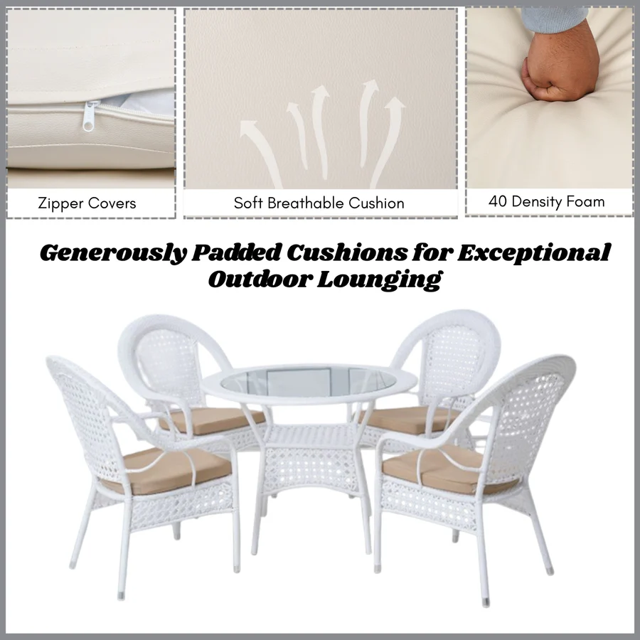 Elevate your patio, garden, or balcony with the Outdoor All-Weather Resistant Rattan Wicker 5-Piece Dining Set in White a perfect blend of durability, elegance, and everyday functionality. Crafted with premium handwoven rattan wicker and a rust-resistant powder-coated metal frame, this dining set is built to withstand all weather conditions—be it rain, sun, or humidity making it ideal for year-round outdoor use. This stylish set includes one spacious dining table with a smooth, glass top for easy cleaning and four ergonomically designed chairs that deliver lasting comfort.