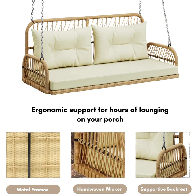 Upgrade your outdoor relaxation with this stylish and durable 2-Person Outdoor Wicker Porch Swing. Crafted with a sturdy powder-coated iron frame and handwoven all-weather HDPE rattan, this swing is built to withstand sun, rain, and daily use without fading or cracking. The spacious dual-seat design comfortably fits two adults, while the soft, thick cushions and supportive backrest offer superior comfort for hours of lounging. Its elegant woven design blends beautifully with any patio, garden, or balcony décor, making it a perfect addition to your outdoor space.