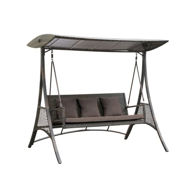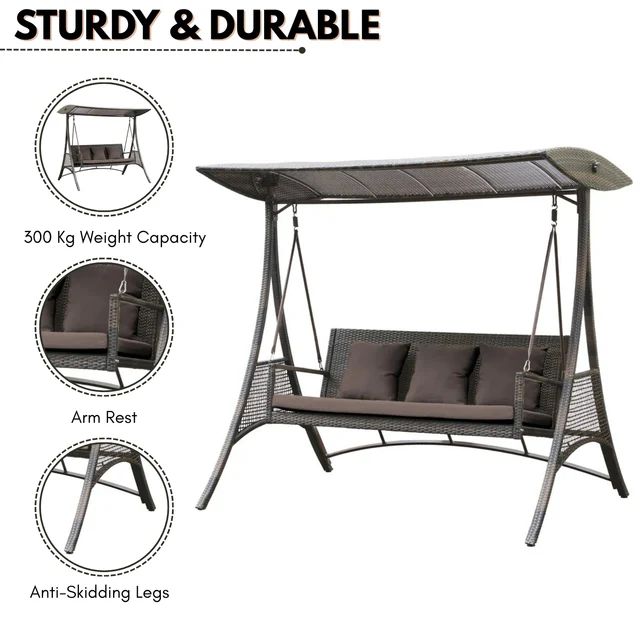 Transform your outdoor space into a relaxing retreat with this elegant 3-seat patio swing chair. Designed with a stylish rattan seat and sturdy swing bench structure, it offers the perfect blend of comfort, durability, and charm. Whether placed in your garden, porch, backyard, or poolside, this swing creates a cozy spot to unwind, enjoy a conversation, or simply sway gently in the breeze. The chair features soft, removable cushions that provide cloud-like comfort while allowing for easy cleaning and maintenance. A built-in overhead shade canopy shields you from direct sunlight, making your outdoor lounging experience even more enjoyable on warm days.