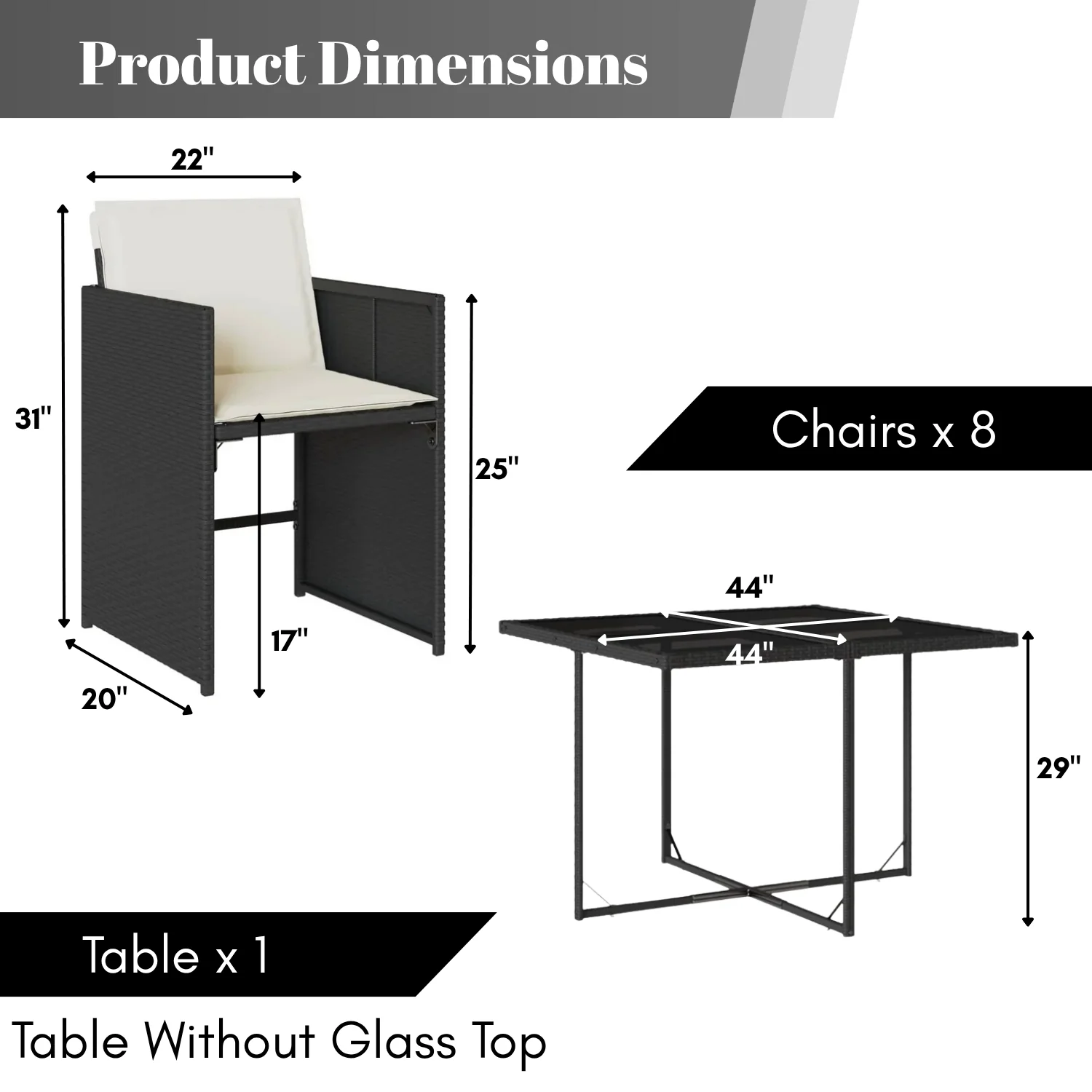 Create a stylish and functional outdoor dining space with this 9-Piece Outdoor Patio Rattan Dining Set, featuring a table and 8 cushioned chairs. Designed for comfort and built for durability, this set is perfect for gardens, balconies, poolside lounges, or backyard gatherings. Crafted with weather-resistant HDPE rattan and a rustproof powder-coated metal frame, it offers year-round durability against UV rays, rain, and fading. The tabletop provides a modern touch and easy maintenance, while the plush, removable seat cushions ensure long-lasting comfort and support. With a space-saving stackable design, this outdoor dining set combines style, function, and comfort ideal for hosting friends and family outdoors.