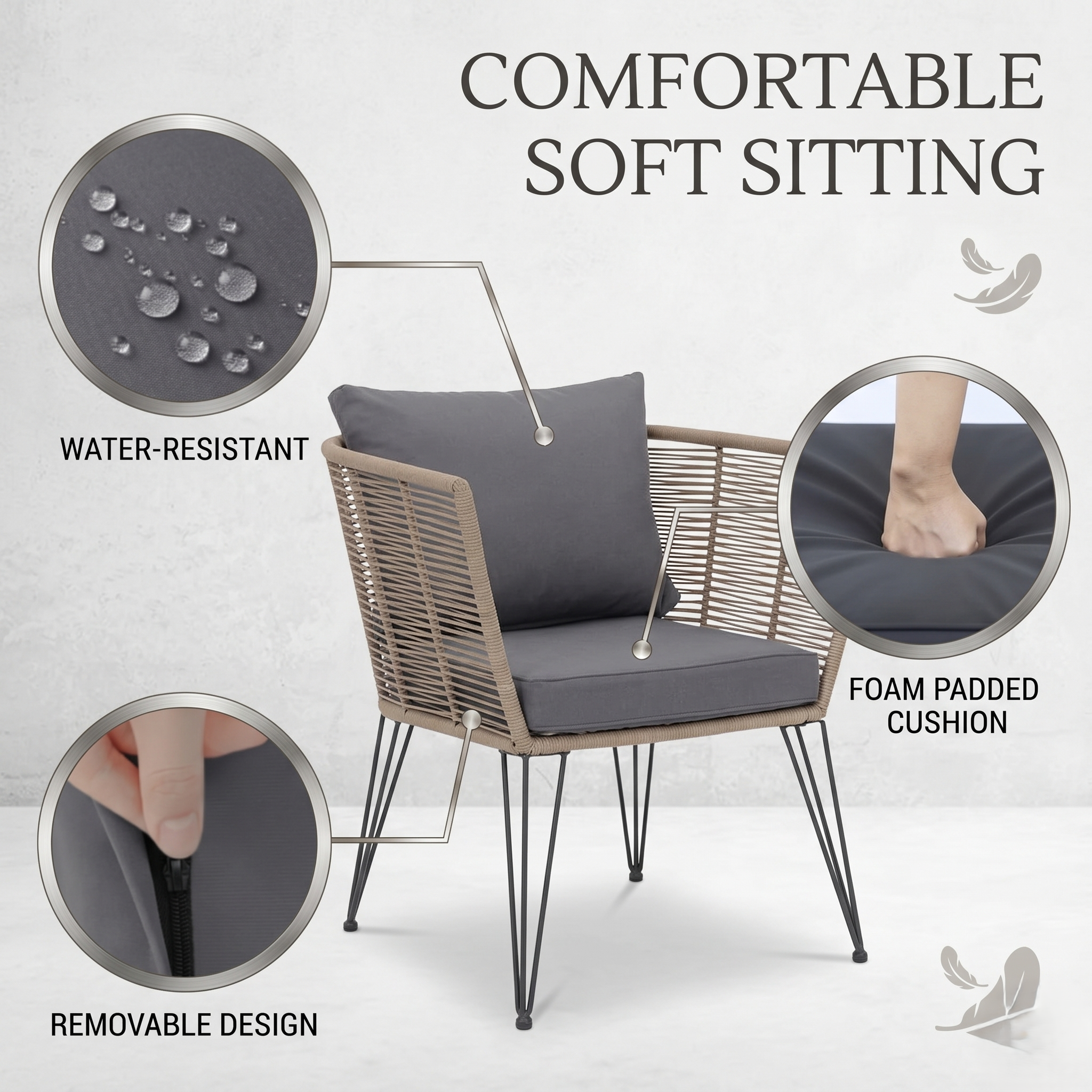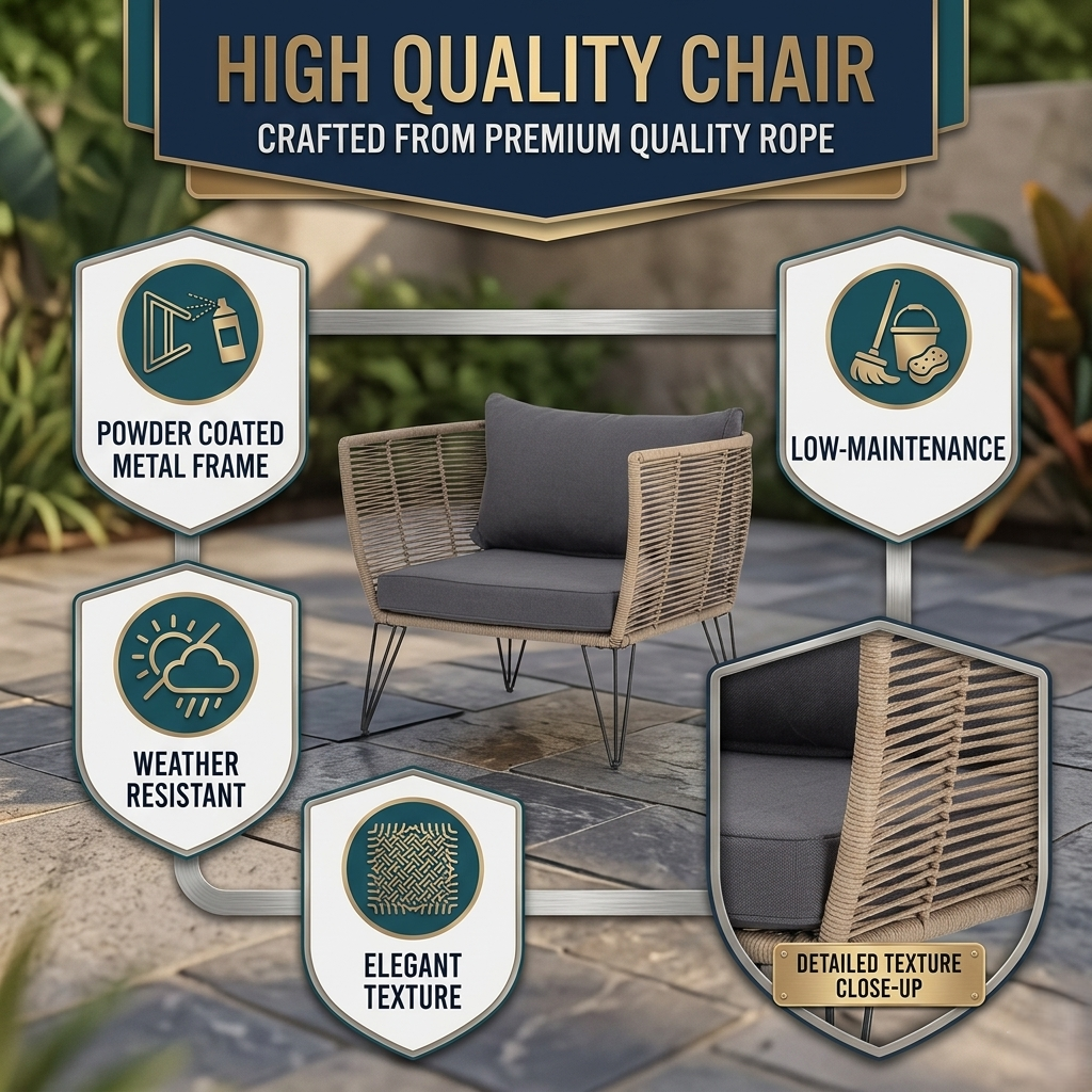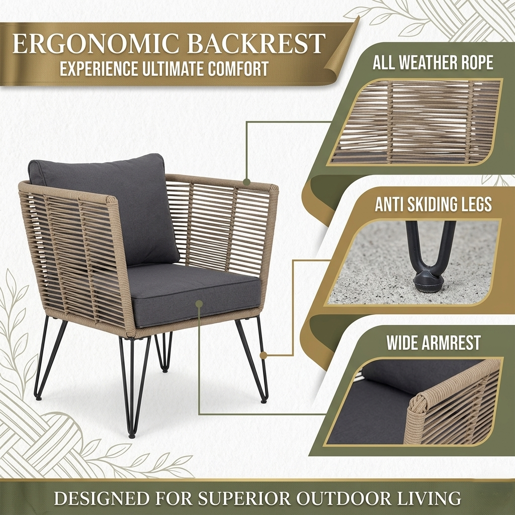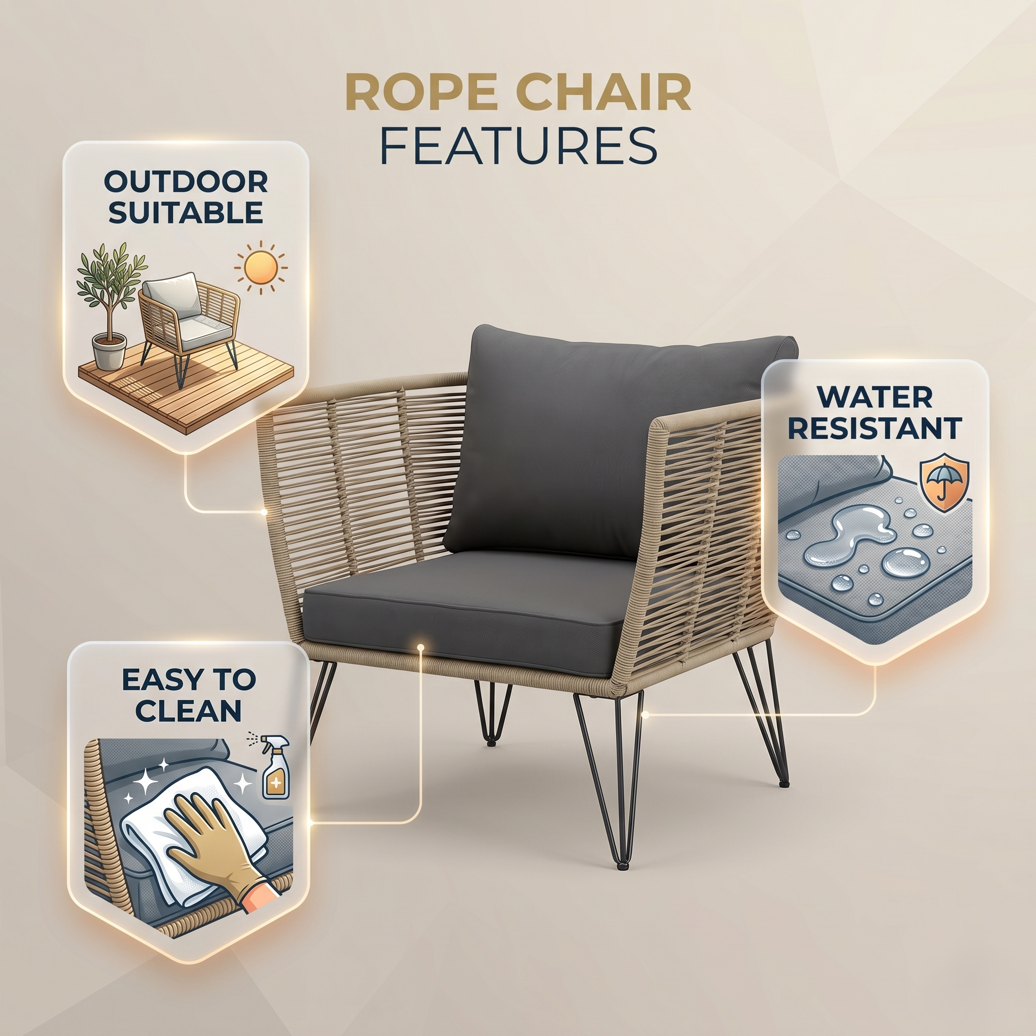 Transform your outdoor space into a personal retreat with our Outdoor 1 Piece Patio Single Seater Bistro Sofa Chair, crafted for both elegance and endurance. Made with handwoven weather-resistant rope and supported by a rust-proof powder-coated metal frame, this bistro-style single seater combines modern design with long-lasting durability—perfect for every corner of your outdoors, from balconies and terraces to gardens, lawns, and poolside decks. Designed to deliver both comfort and charm, the chair comes with a soft, plush all-weather cushion that resists moisture and fading, ensuring a cozy and inviting seat in any season.