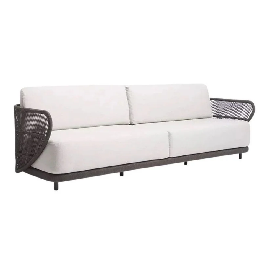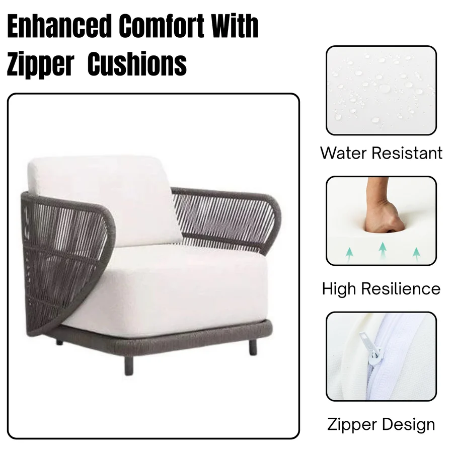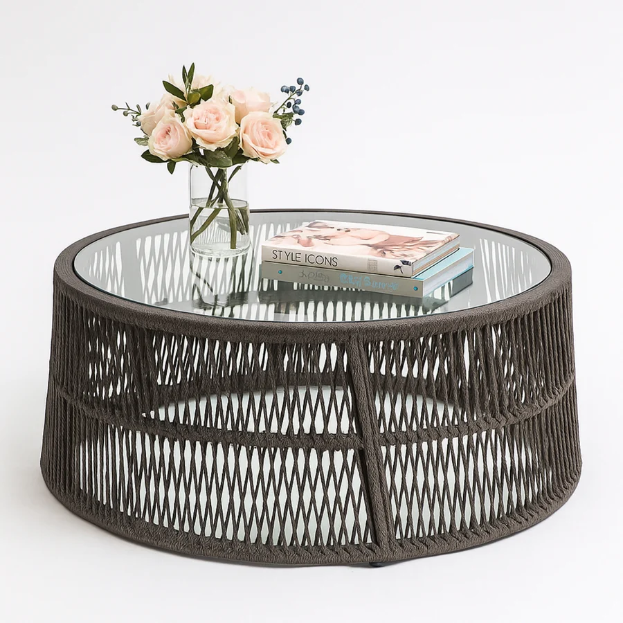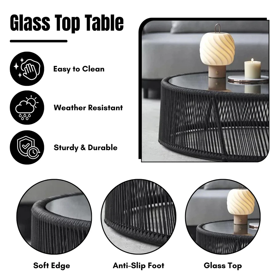 Elevate your outdoor living experience with this Outdoor Rope 4-Seater Sofa Set, a perfect blend of modern elegance, durability, and comfort. Crafted with a handwoven premium rope design, this set includes a spacious two-seater sofa, one single-seater sofa, one glass-top center table, and a stylish side table, making it ideal for relaxing with family or entertaining guests. The powder-coated metal frame ensures long-lasting strength and stability, while the all-weather rope weaving provides flexibility, breathability, and resilience against sun and rain. The glass top on both the center and side tables offers a sleek, scratch-resistant, and easy-to-clean surface, adding functionality with style. Designed with soft, water-resistant cushions, this set provides cloud-like comfort while being low-maintenance.
