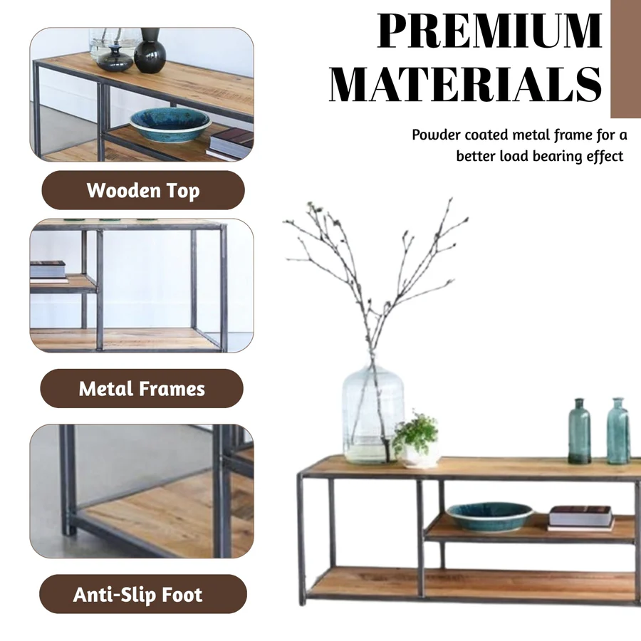 Elevate your living space with this premium Console Table, blending the rich warmth of natural Sheesham wood with the bold stability of a powder-coated metal frame. Designed for both modern and rustic interiors, this piece serves as a stylish focal point in entryways, living rooms, or behind sofas. The solid Sheesham wood top, known for its distinctive grain patterns and natural finish, offers timeless elegance and durability. It is expertly hand-finished to preserve the unique texture of the wood while providing a smooth, functional surface. The metal base adds a minimalist industrial edge, ensuring lasting support with a sturdy, wobble-free structure. Whether used to display décor, organize essentials, or hold lighting elements, this console table is both visually appealing and highly practical.